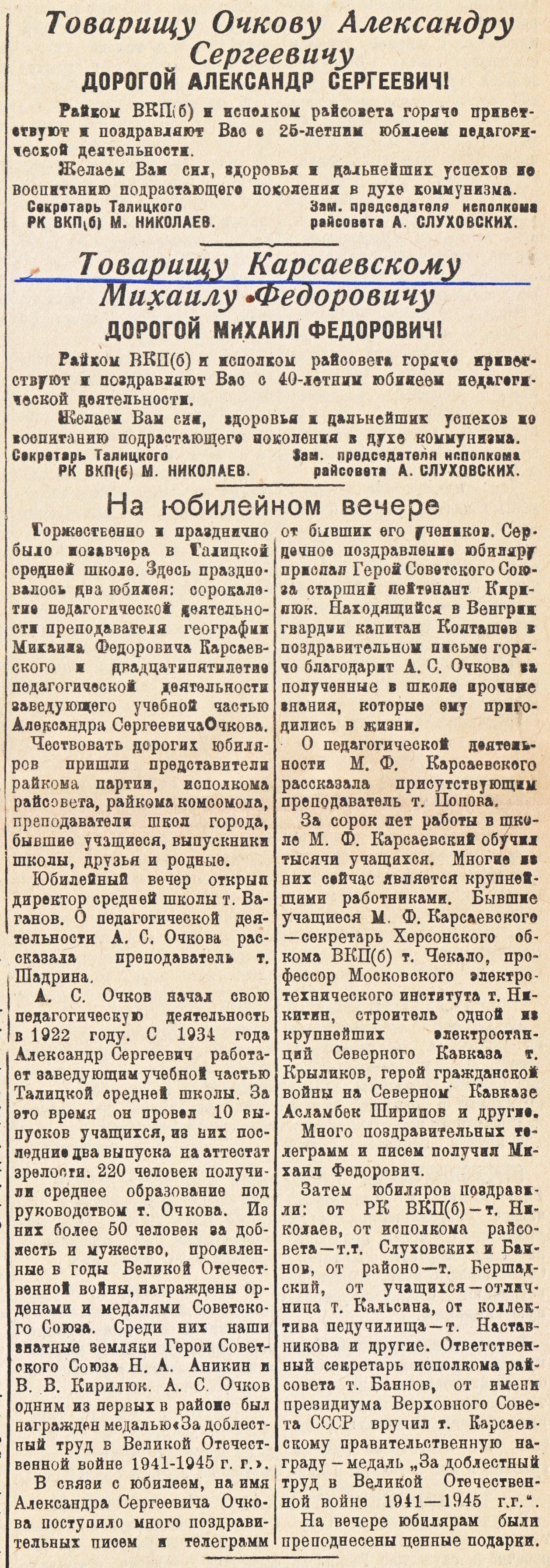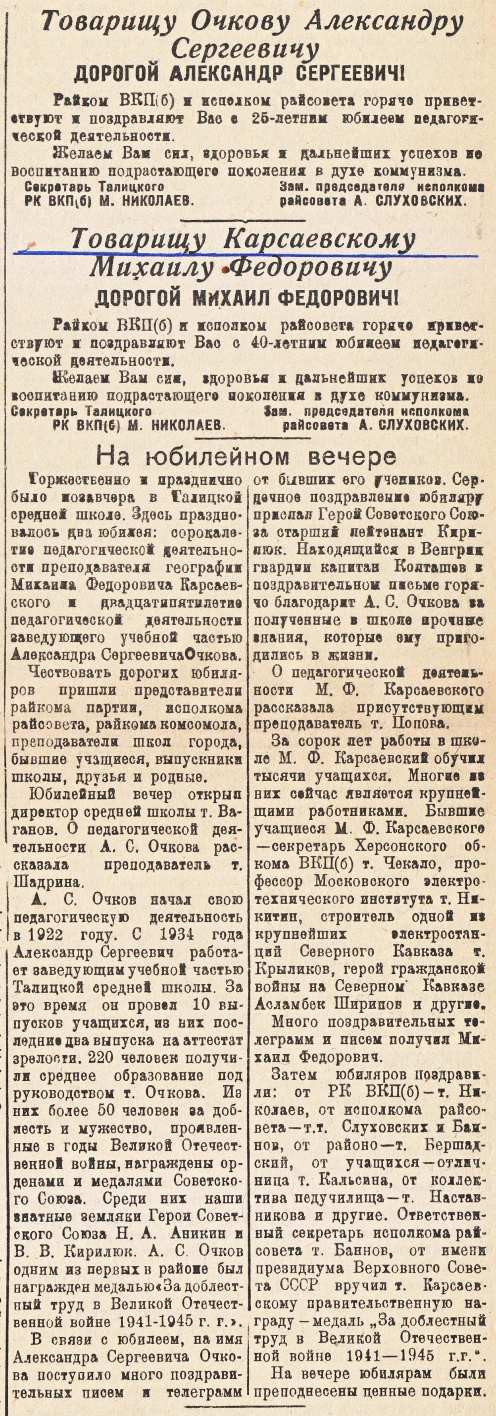 поздравление Карсаевского М.Ф. с юбилем и вручением награды в газете "Коллективная стройка", №46, 6 июня 1946г.