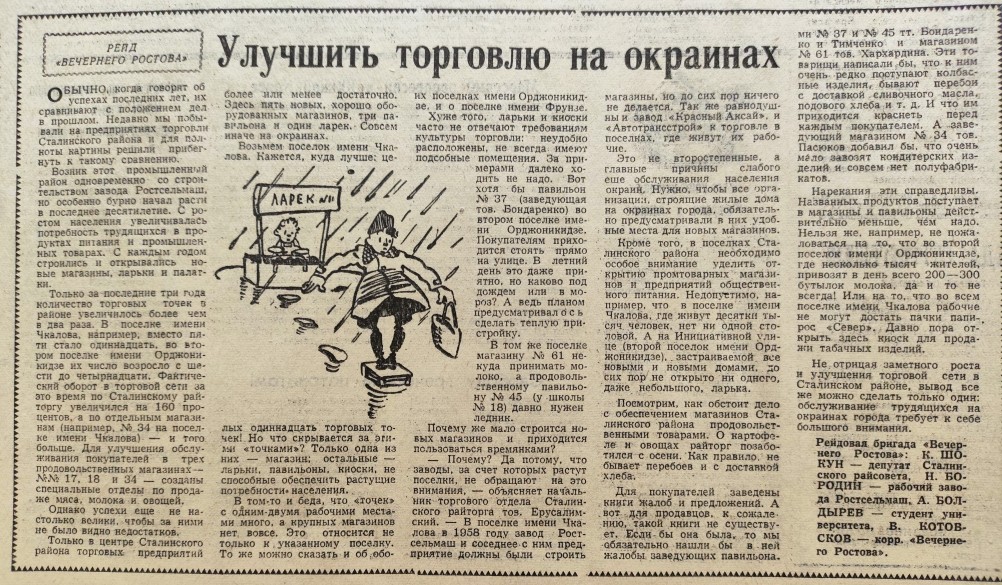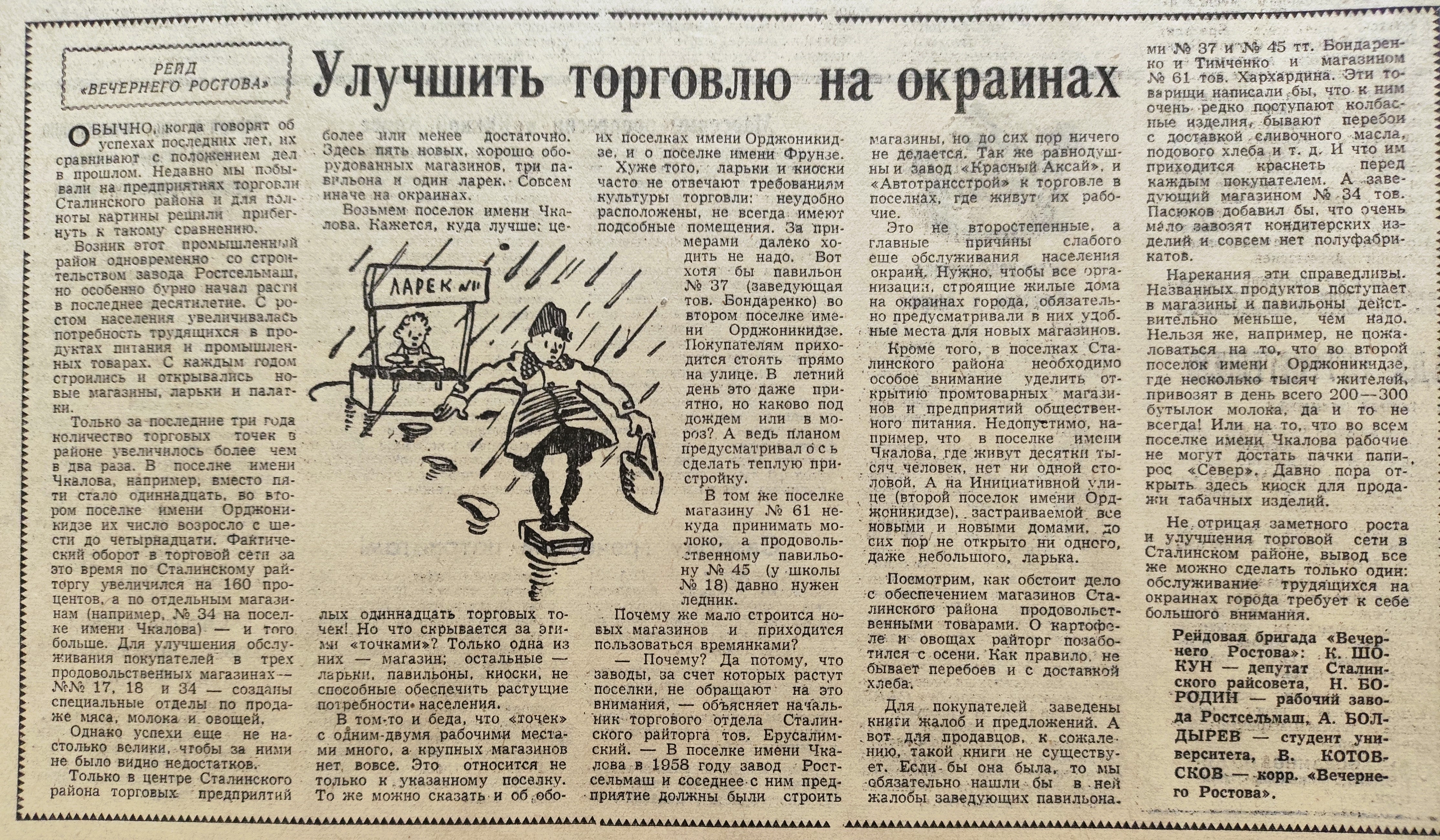 Я не могу представить, на сколько нужно разделить количество сегодняшних магазинов и предприятий сферы услуг, чтобы получить их количество в 30-х годах. Их было в сотни раз меньше. И такой ларёк был для маленького района торговым центром. Его стены, обклеенные объявлениями, были информационным центром, и клубом, и газетой «на ногах».