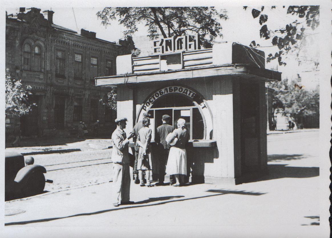 На фото можно в деталях разобрать два чудесных ростовских ларька. Я помню последние из таких. Они стояли как правило на окраинах, в рабочих посёлках. Торговали в них самым необходимым, хлебом, табаком, овощами, селёдкой, сахаром, спичками и прочим, всем тем, без чего было не прожить. И оказывали самые насущные услуги. Например, ремонтировали обувь.