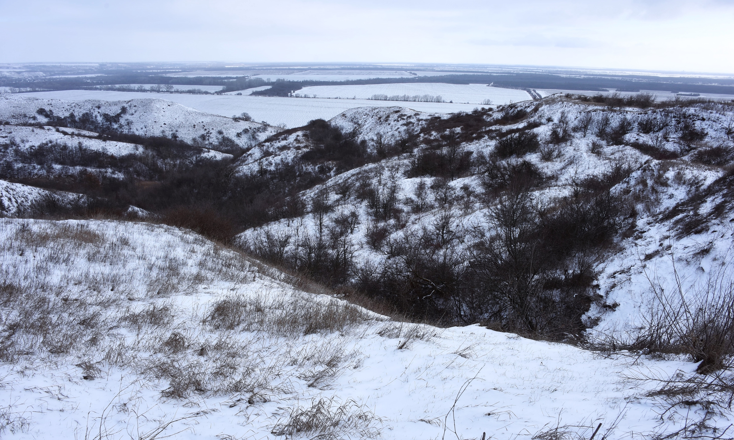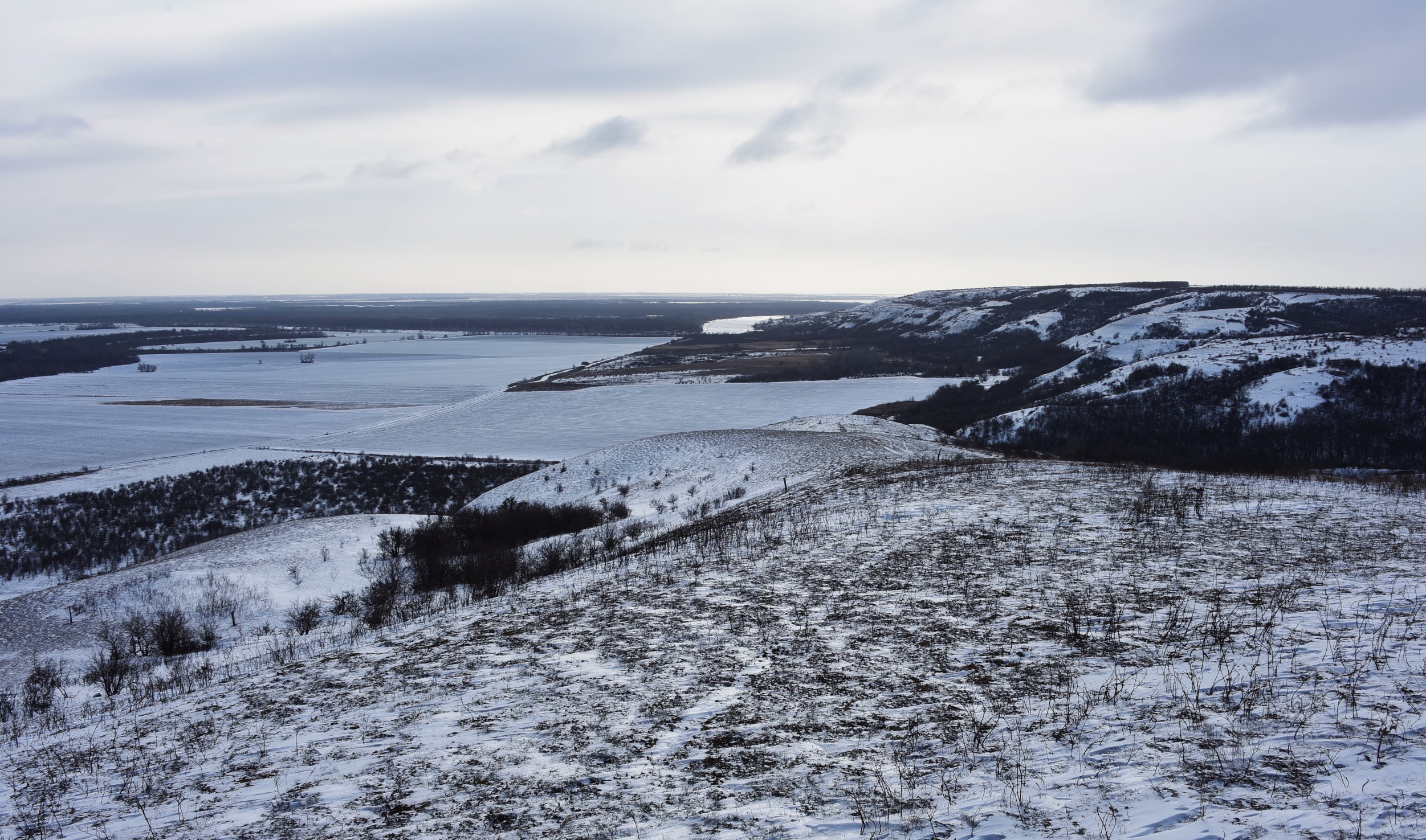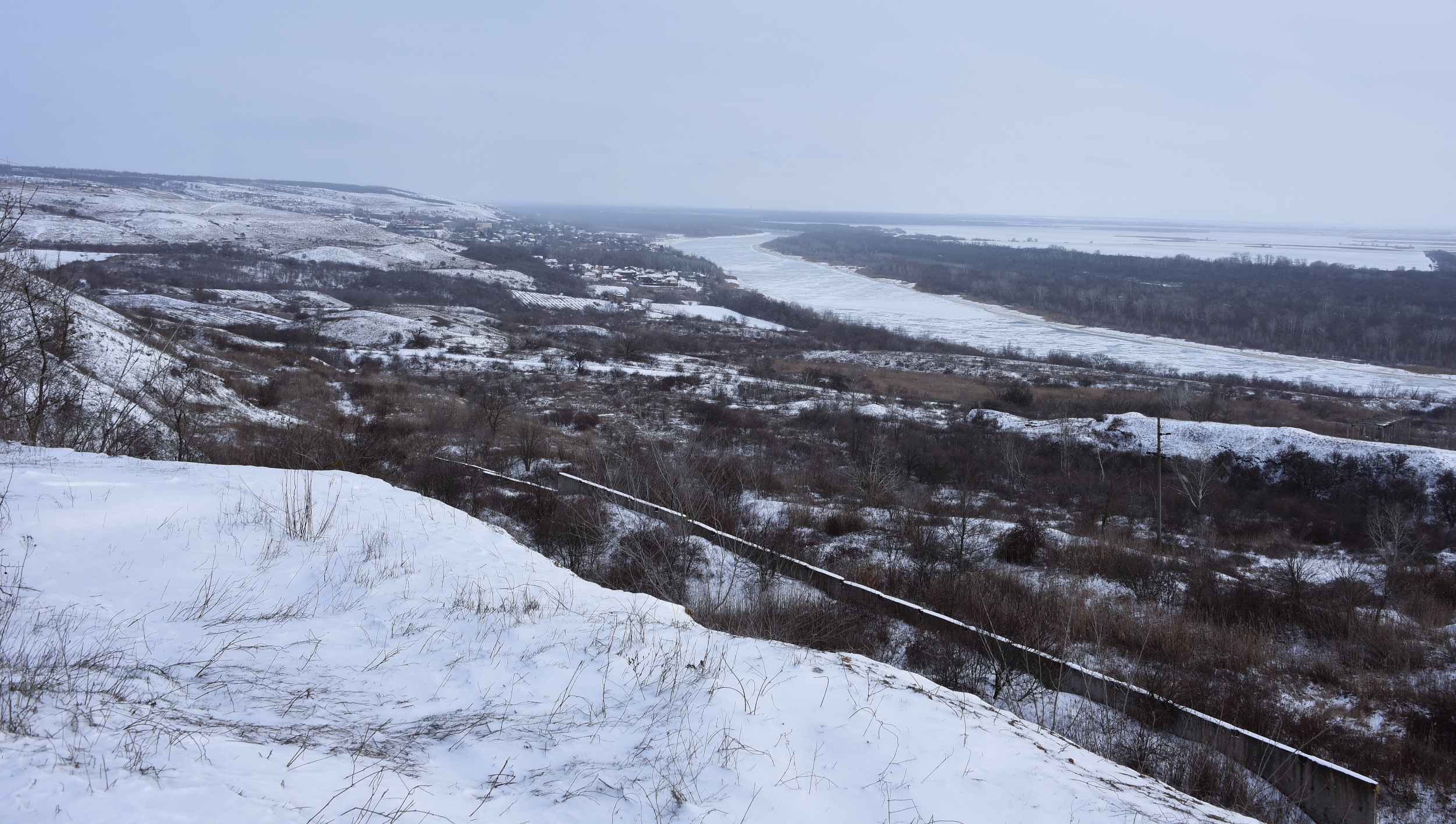 Начал со смотровой площадки над Пухляковским. Месил снег пробиваясь к Красному яру. Кружил по холмам над Каныгиным, Ольховским и Виноградным. Спустился к Сухому Донцу и опять поднялся на холмы.