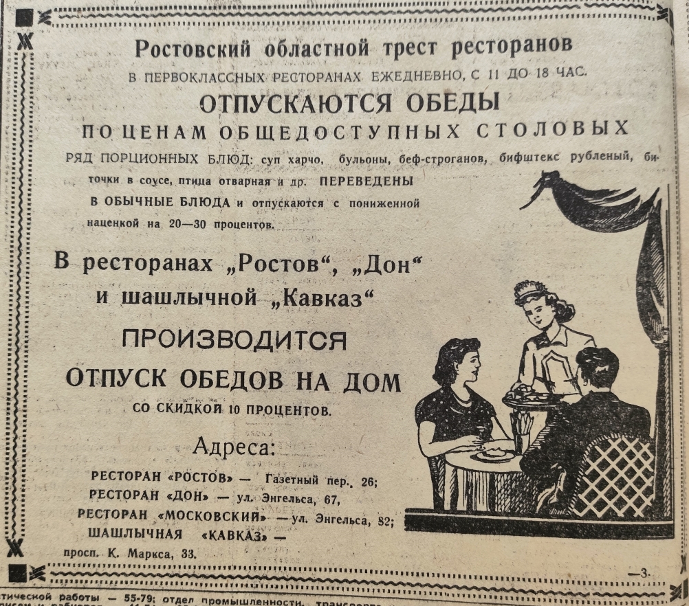 И никто никогда среди моих знакомых не заказывал обеды из ресторана. Все в то время были уверены, что в рестораны простые люди ходят по большим юбилеям, постоянные посетители там всякие дельцы, спекулянты и прочие тёмные личности. И обвешивают, и обсчитывают там безбожно.