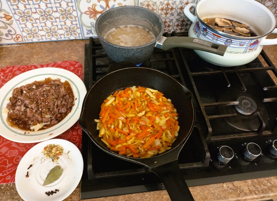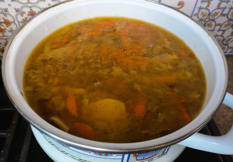 И вот грибы варятся, перловка варится, а коренья почти готовы.