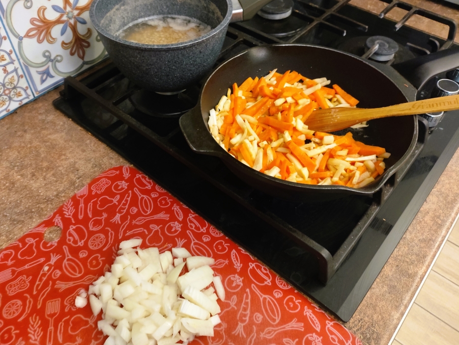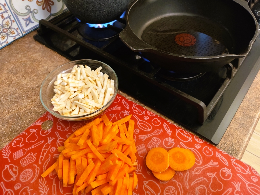 Затем я нарезал белый корень и морковь и поставил их жариться на растительном масле.