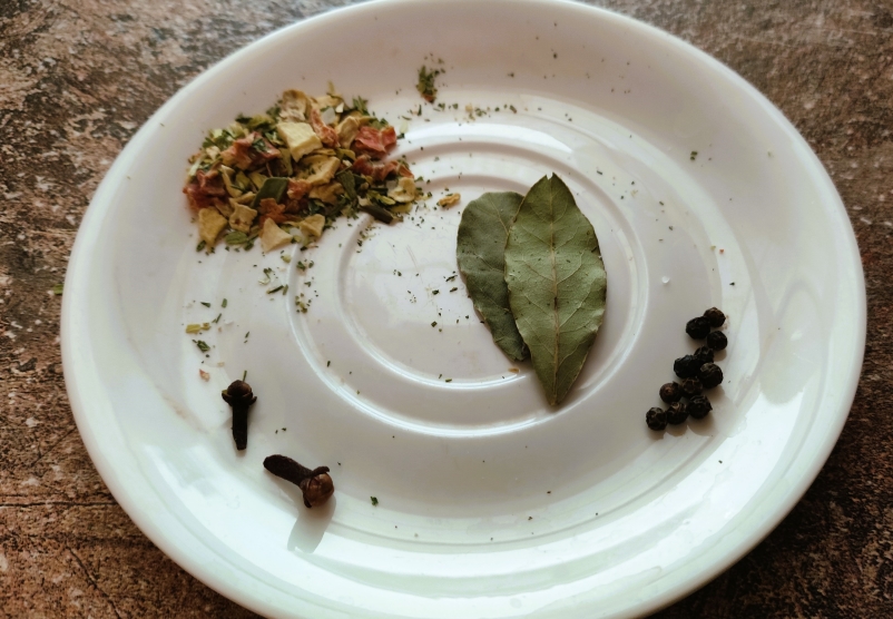 Приготовил специи. В этом супе их не надо много. Пару лавровых листов, пару гвоздик и немного перца горошка. Ещё у меня есть готовая присыпка к супам.