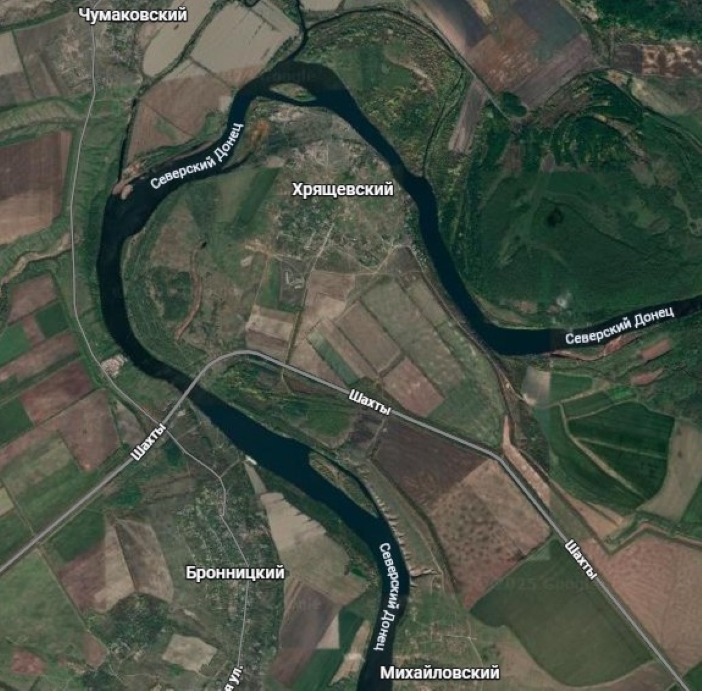 У основания этой петли, археологи нашли поселения людей каменного века. Примерно там, где я нарисовал овалы на берегу Донца. Эти поселения названы по имени близлежащих хуторов – Хрящи и Михайловское.