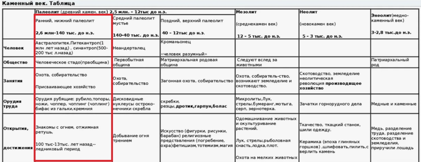 Ниже приведу таблицу, в которой описаны главные черты разных периодов каменного века. Период, к которому относятся поселения, о которых здесь говорится, обвёл красным.