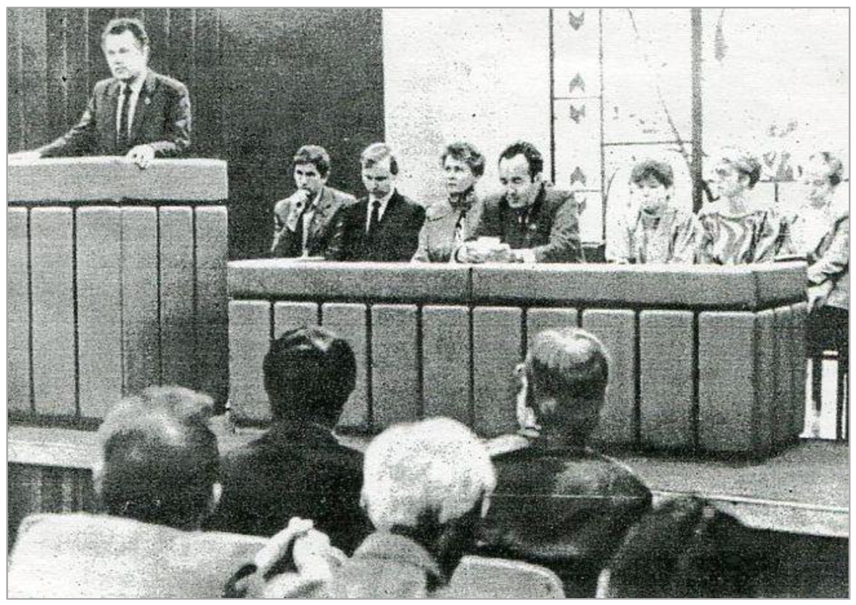 | Торжественное собрание участников сборки первого трактора Т-330 Карсаевская Галина Алексеевна (президиум, третья слева за столом), 1988 г. | ||