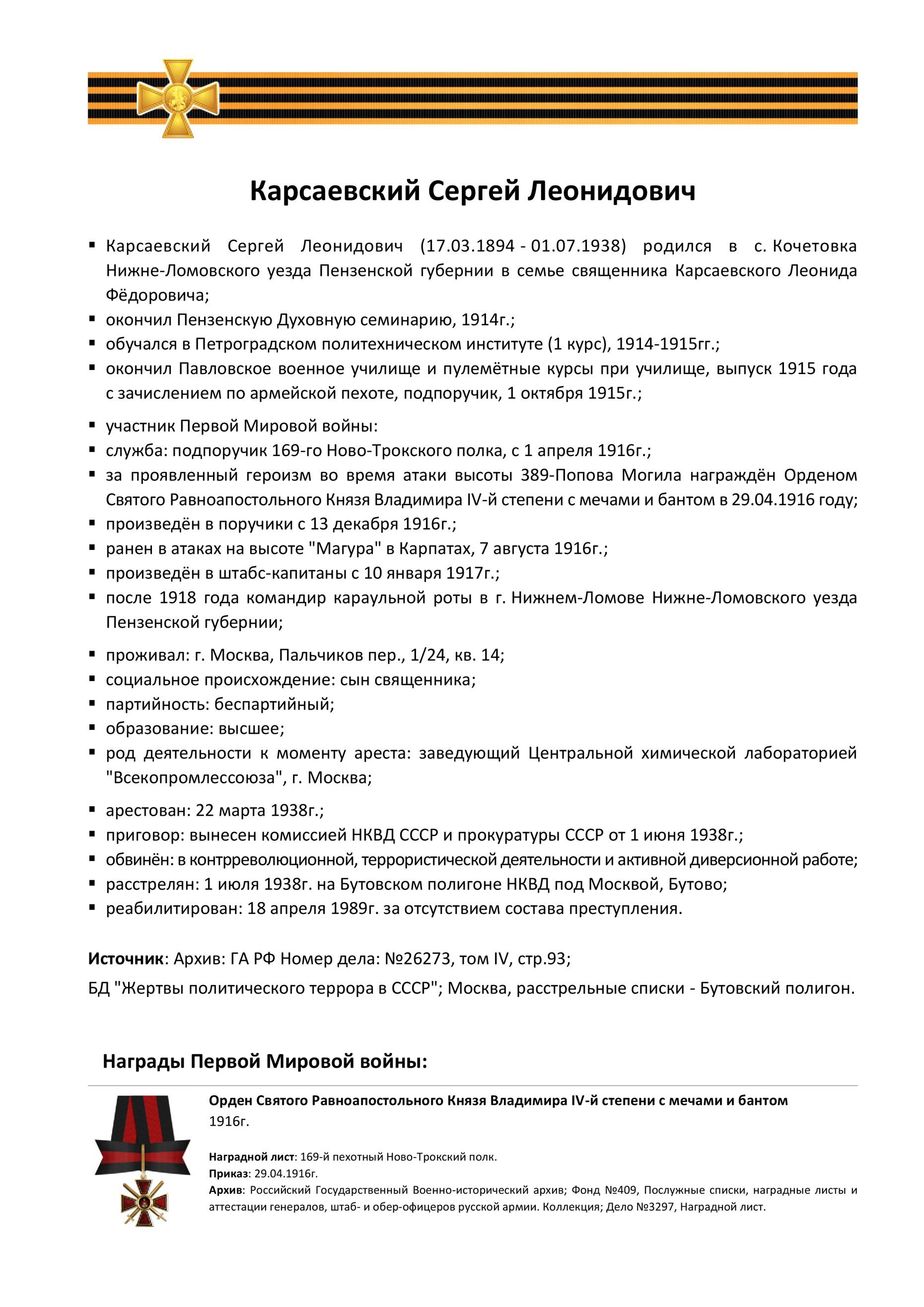краткая биография | ![]() Карсаевский Фёдор Фёдорович |