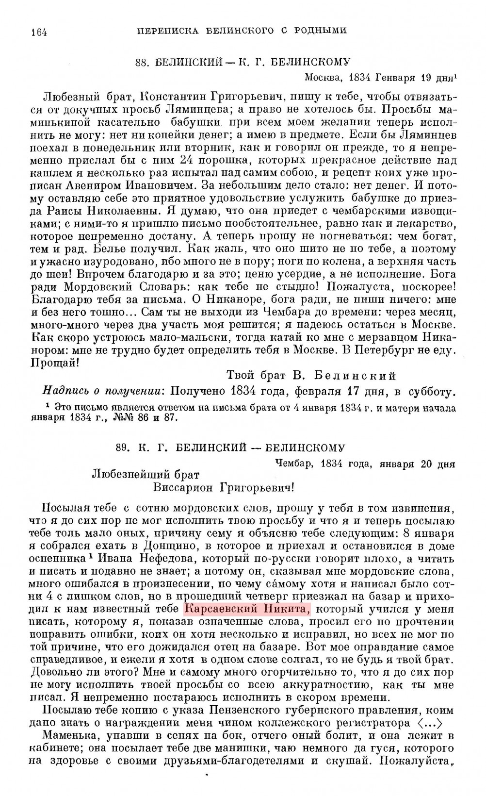"К. Г. Белинскому - Белинскому, Чембар, 1834 года, января 20 дня
