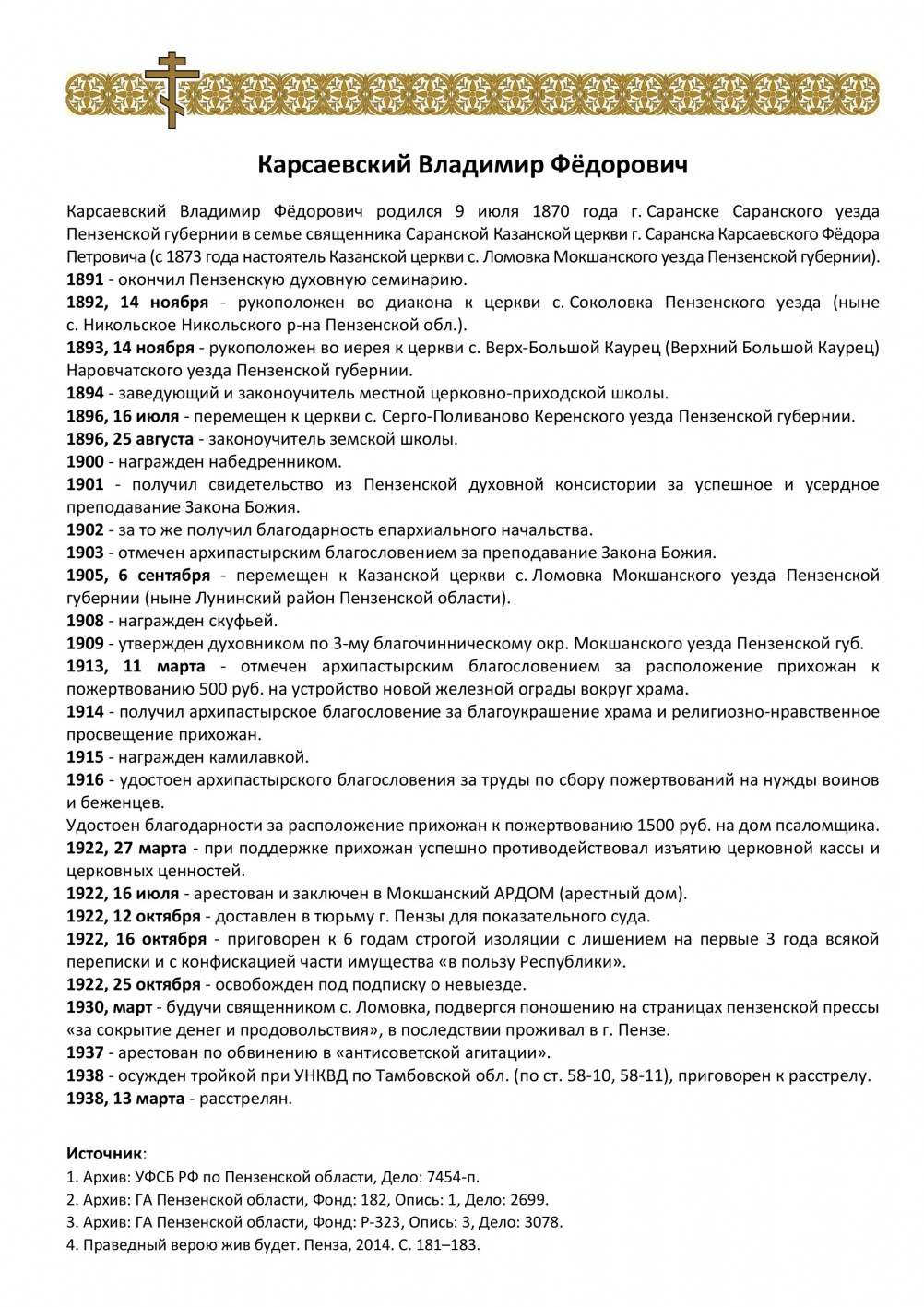 - материалы, предоставленные Пензенским историком-краеведом Дворжанским Александром Игоревичем;