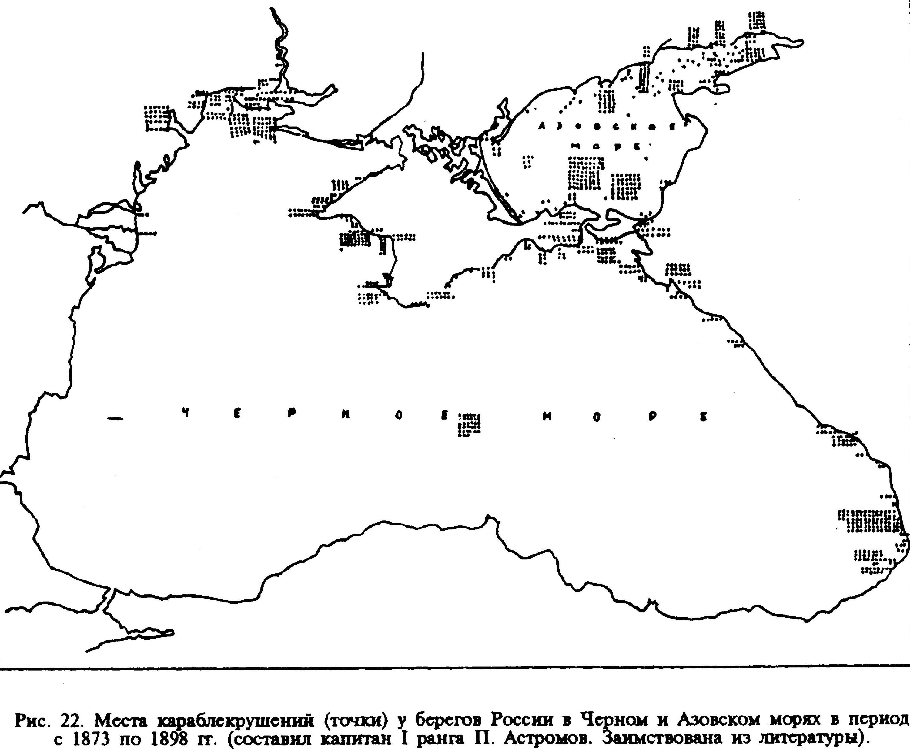 Сейчас в этой книге я обратил внимание на карту, составленную капитаном I-го ранга П. Астромовым, на которой отмечены места гибели кораблей в Чёрном и Азовском морях в период с 1873 по 1898 гг.