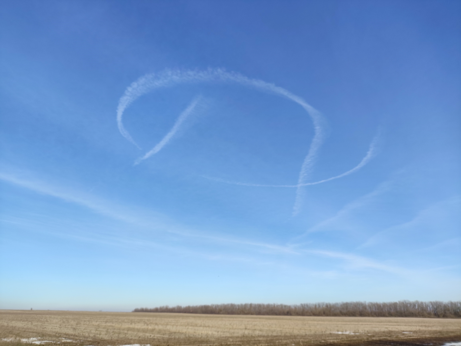 Не так давно, в небе на западе области, наблюдал этот странный знак. Кому-то может показаться, что это обычный инверсионный след от самолёта или самолётов, выполняющих необычный манёвр.