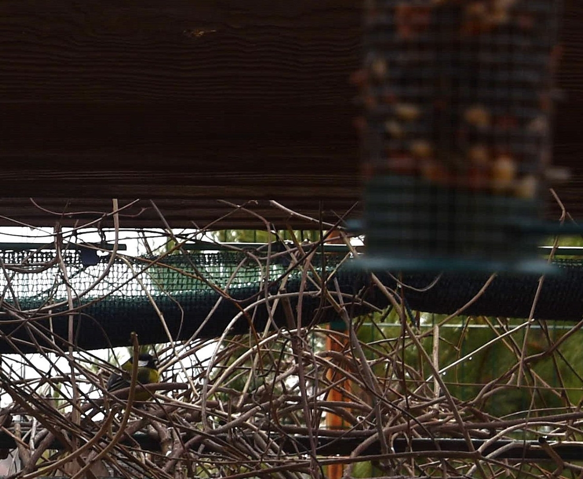 Заметил, что с недавних пор поведение синиц изменилось. Они, разжирев до невозможного, теперь не кидаются на кормушку, а съев положенное, улетают гулять. Но зима суровая и просто так оставить кормушку полную семечек и орехов, жалко. И синицы стали оставлять сторожа. Заметно, что это пожилая, опытная синица, которая, сидя в отдалении, внимательно наблюдает за кормушкой (в правом верхнем углу кадра)