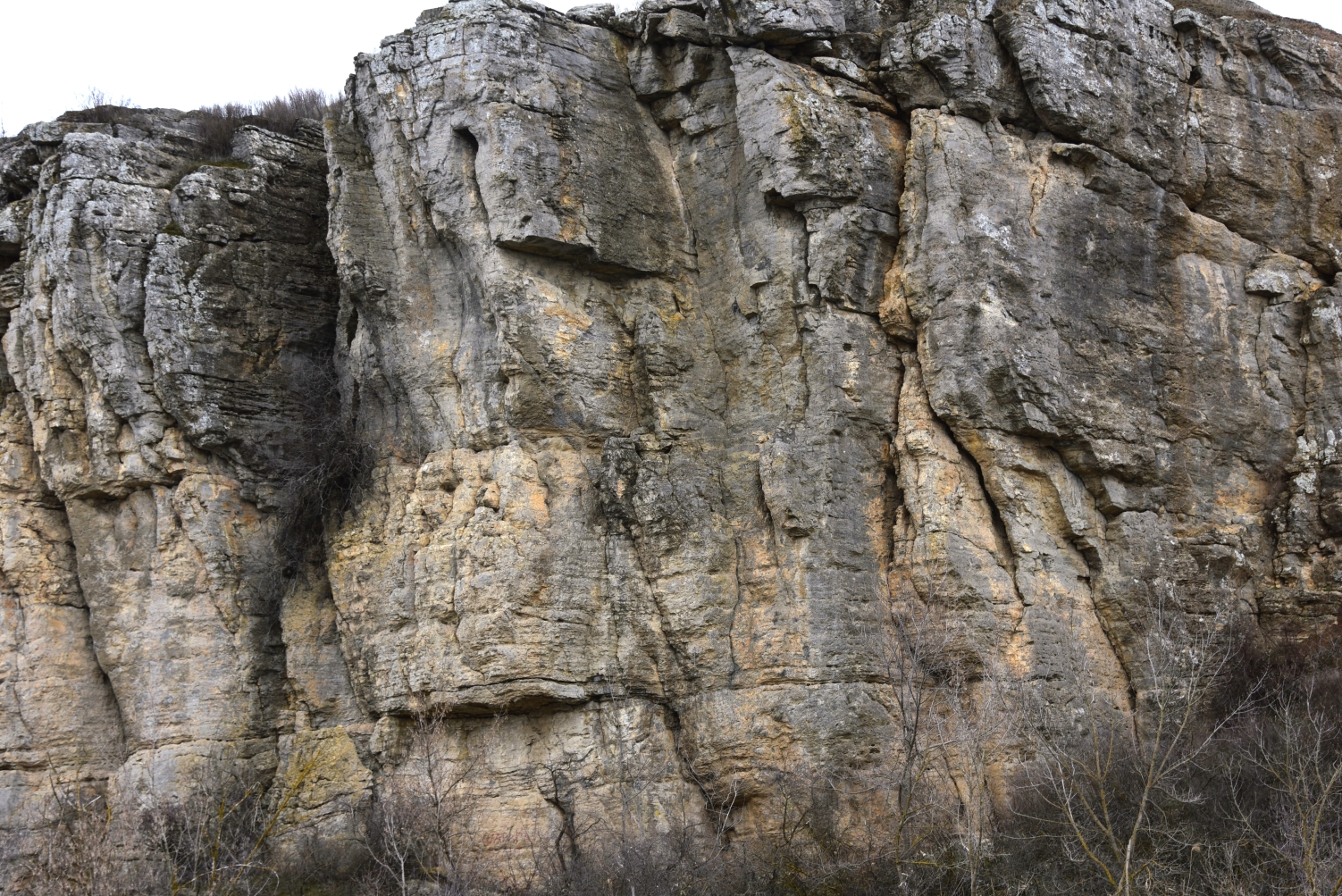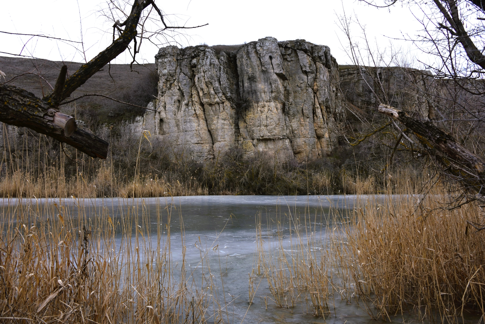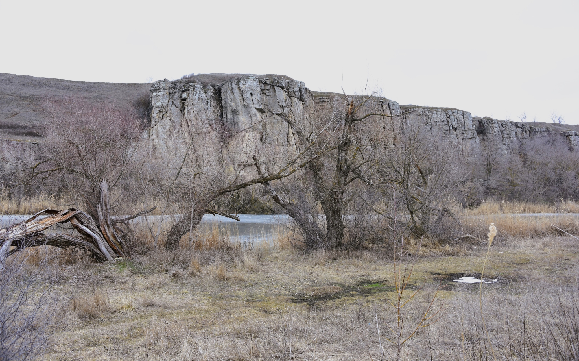 А скалы из известняка, которые летом ослепительно белые, потемнели от талой воды.