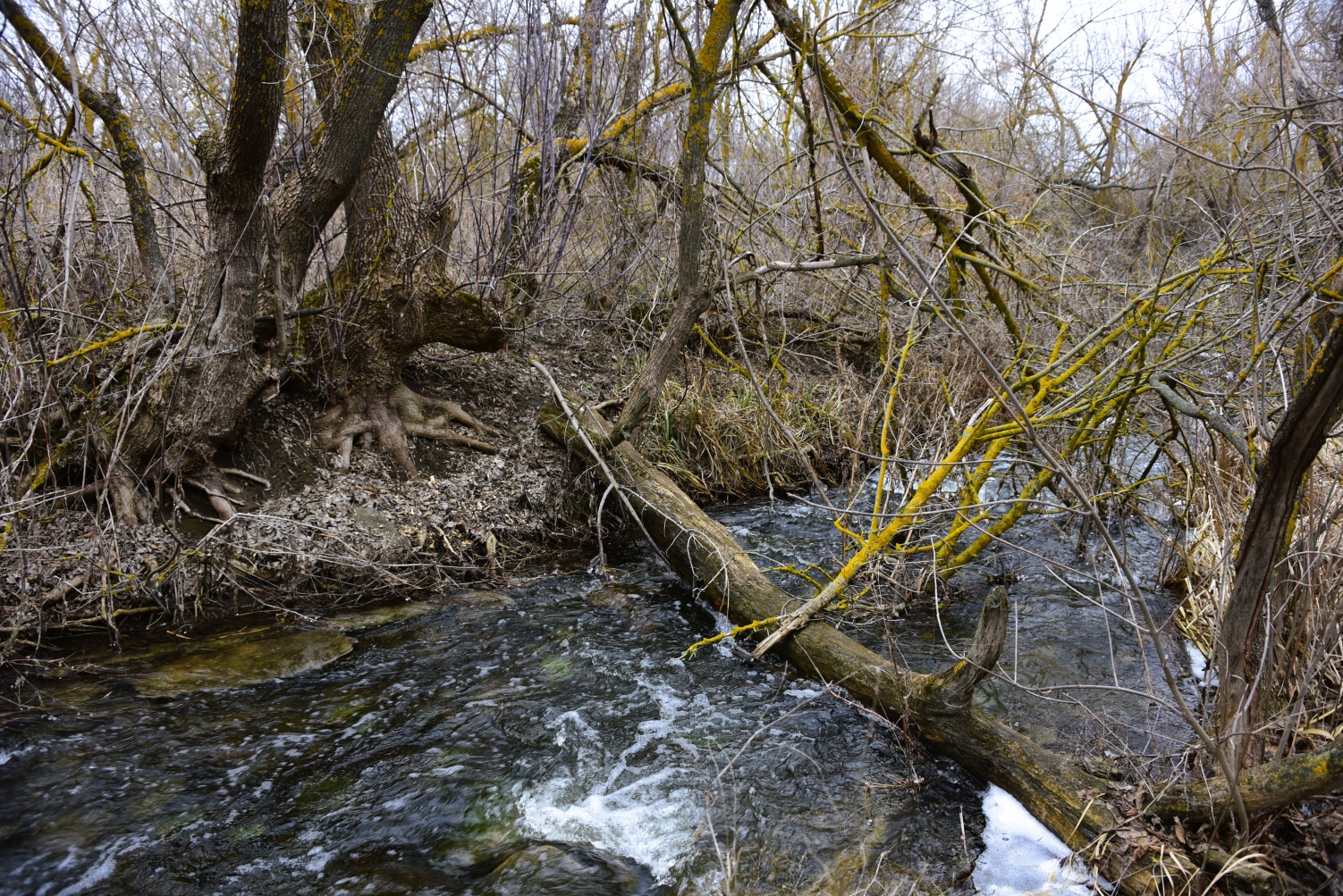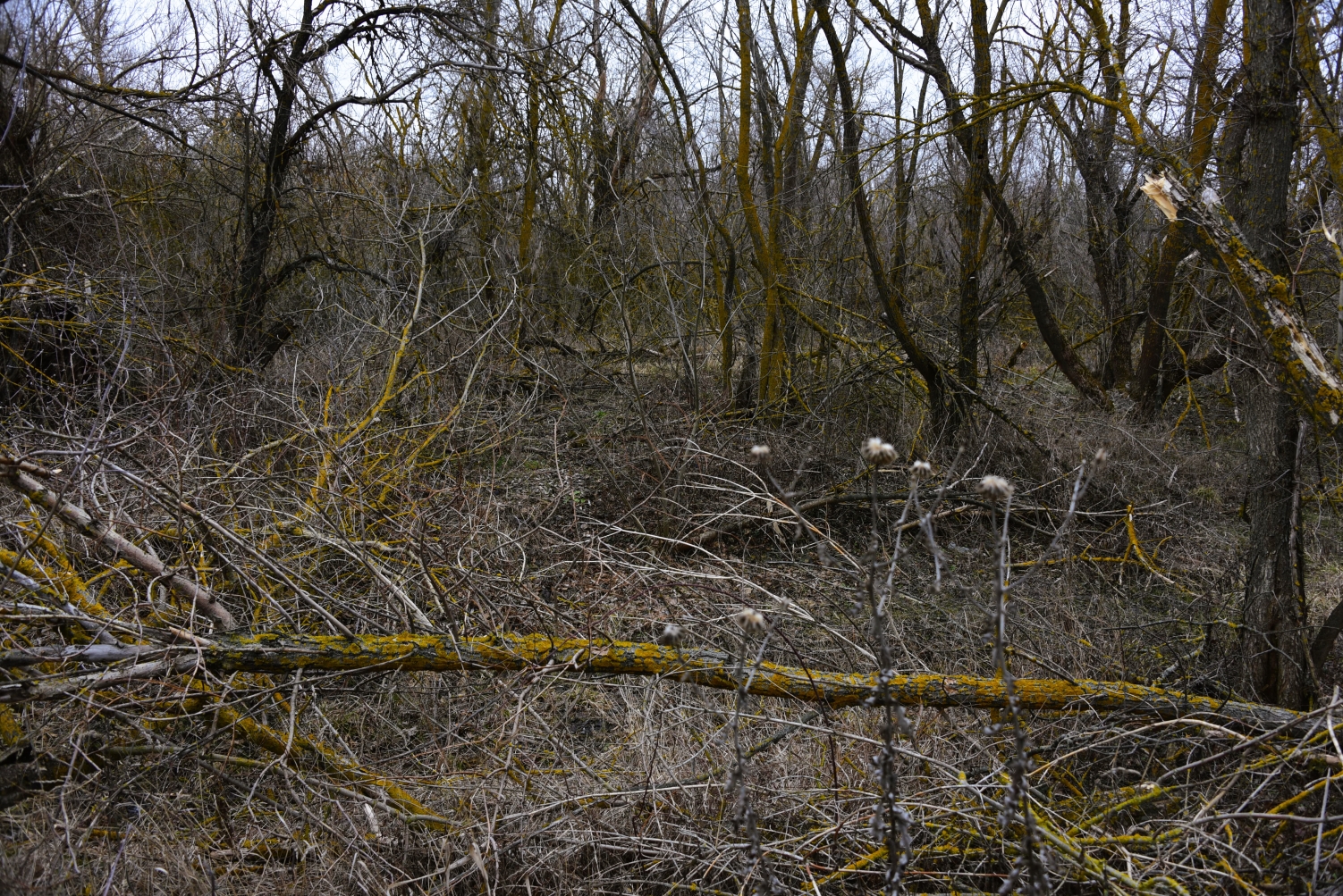 Заброшенная каменная плотина дала приют деревьям. А пруд медленно зарос тростником.