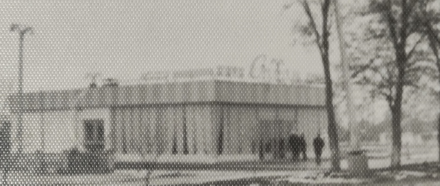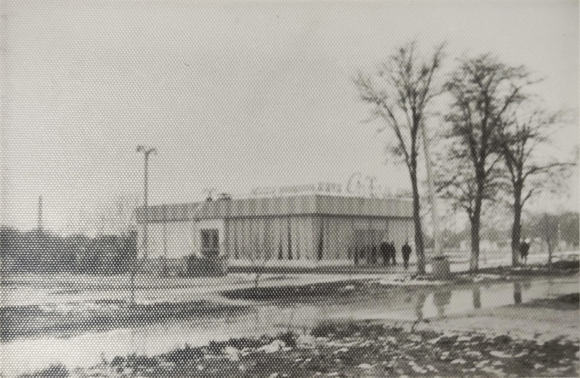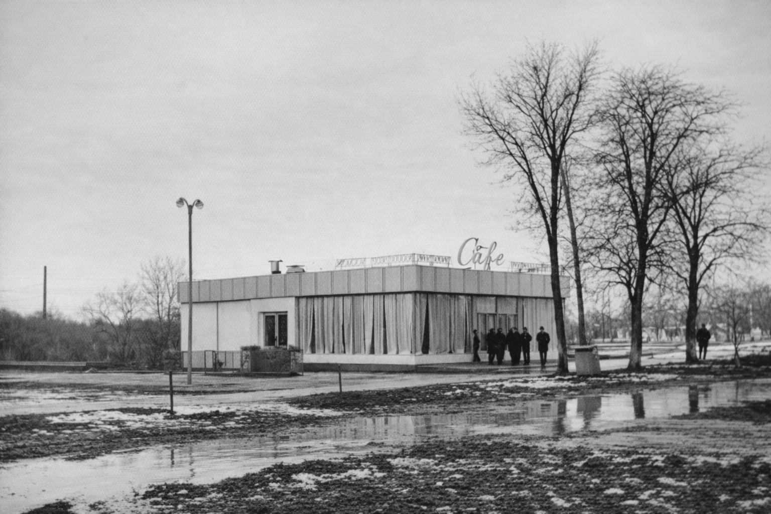 На ней запечатлено кафе «стекляшка». Похоже, что расположено кафе на не вполне благоустроенной территории. Вдали видна заводская труба и дом с четырёхскатной крышей.