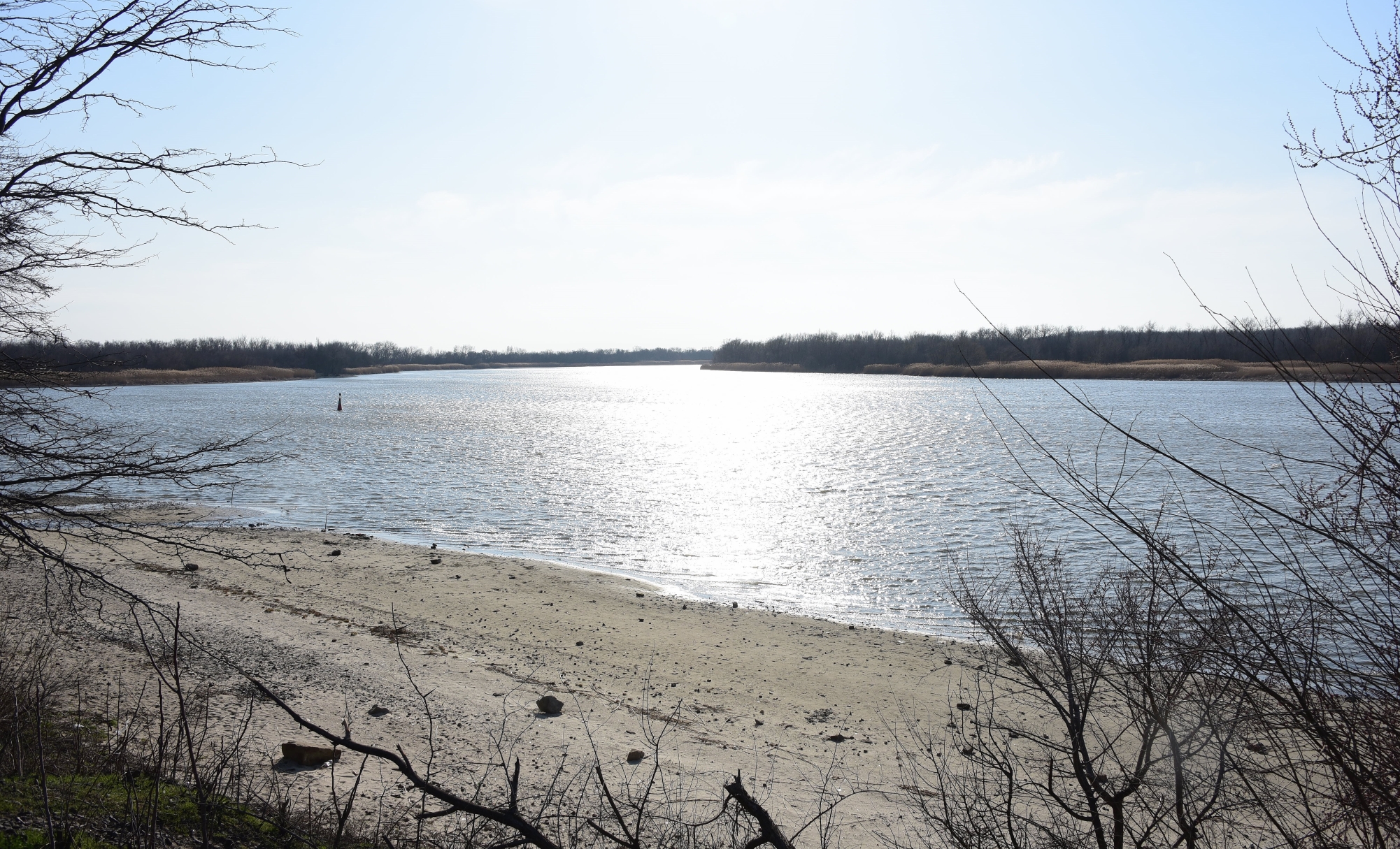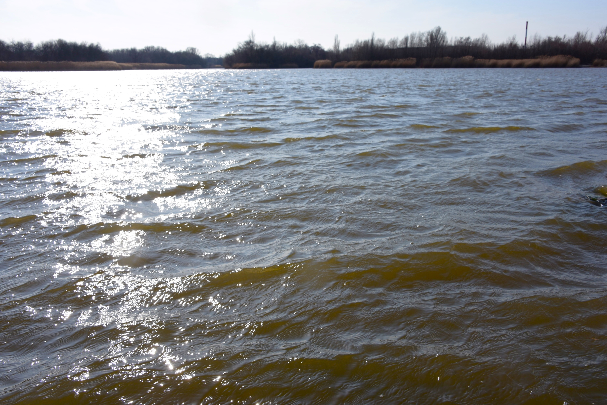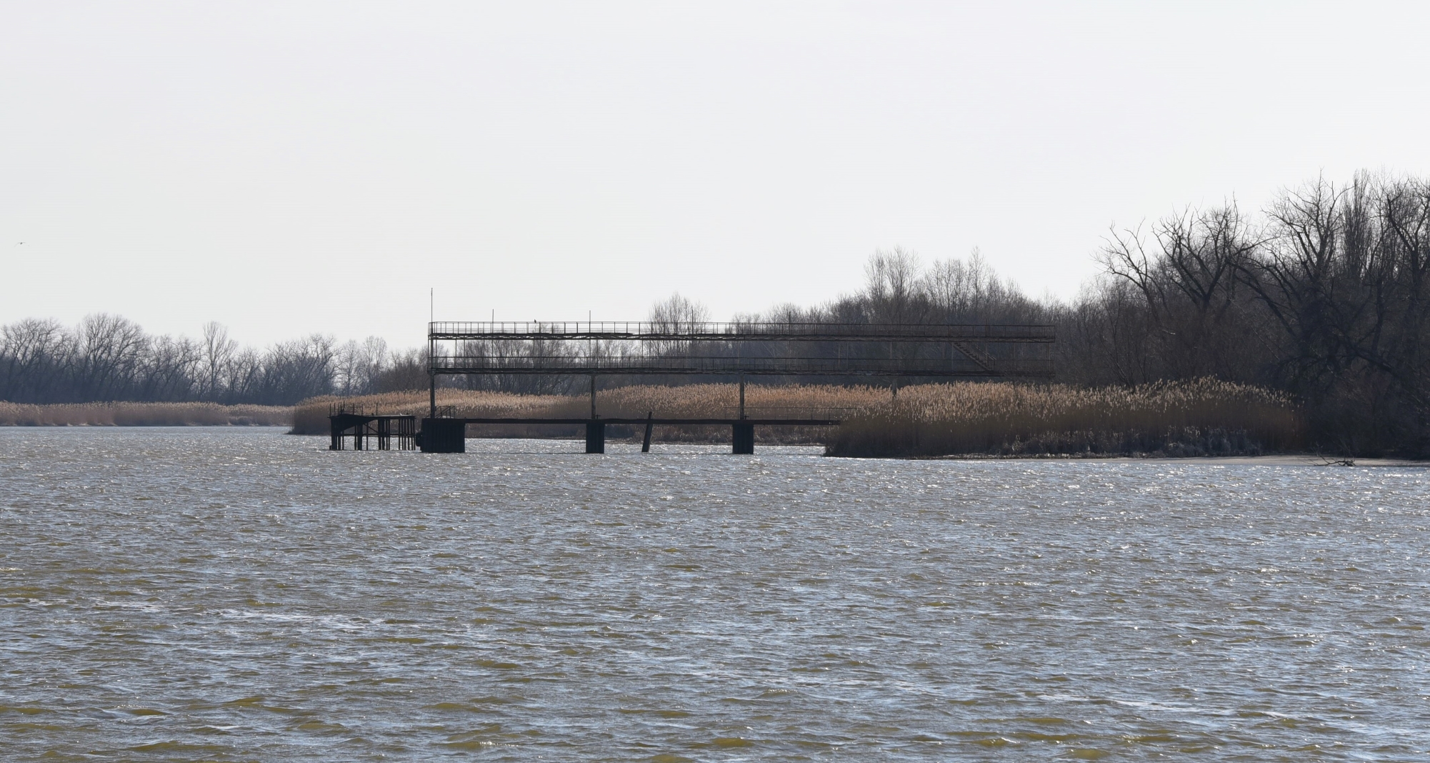 Воды много. И река помутнела, побурела принимая талую воду. Дует сильная верховка, но уровень реки не падает. Половодье.
