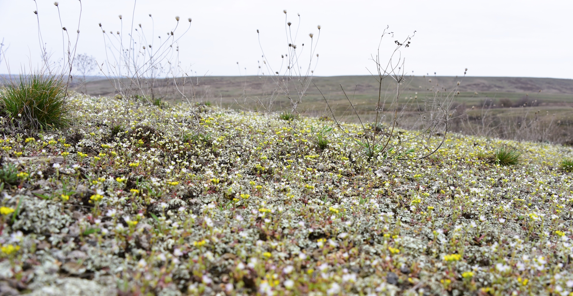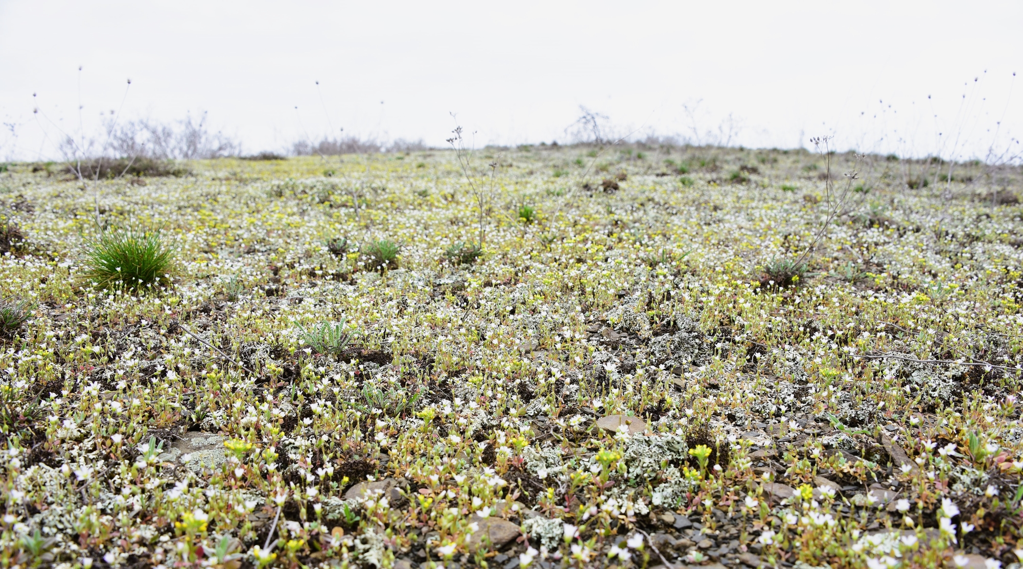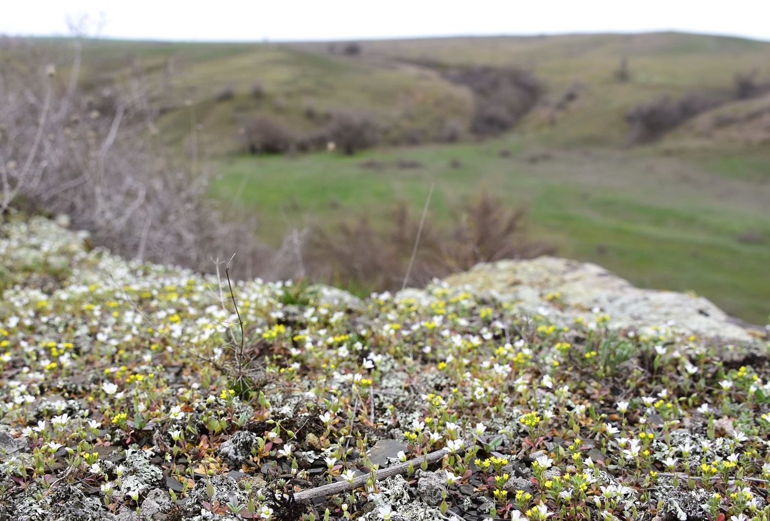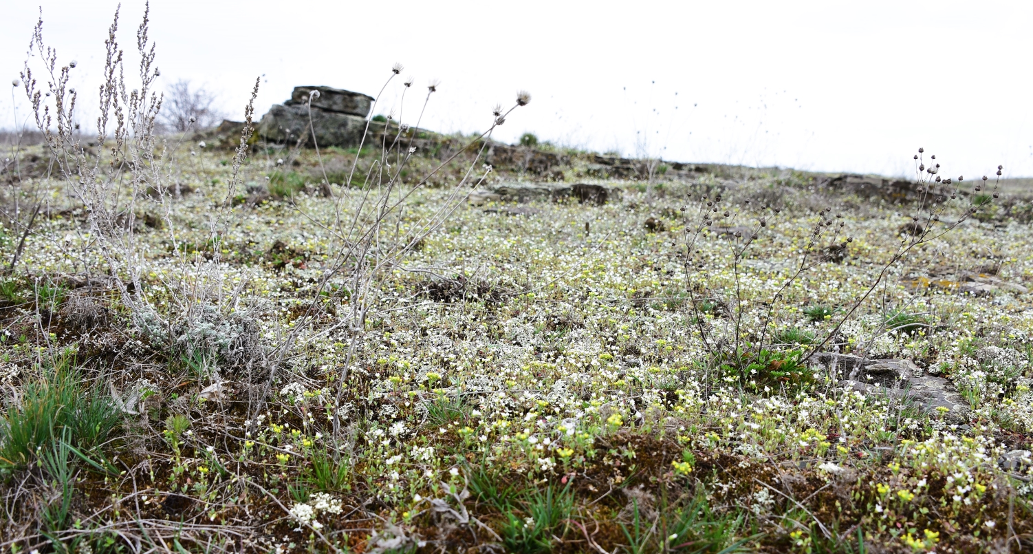 И среди цветных камней и прошлогоднего сора вы увидите цветущую степь. Белые шары кладонии листовой, желтые цветы бурачка простого, крестики веснянки весенней, и колпачки костенца зонтичного.