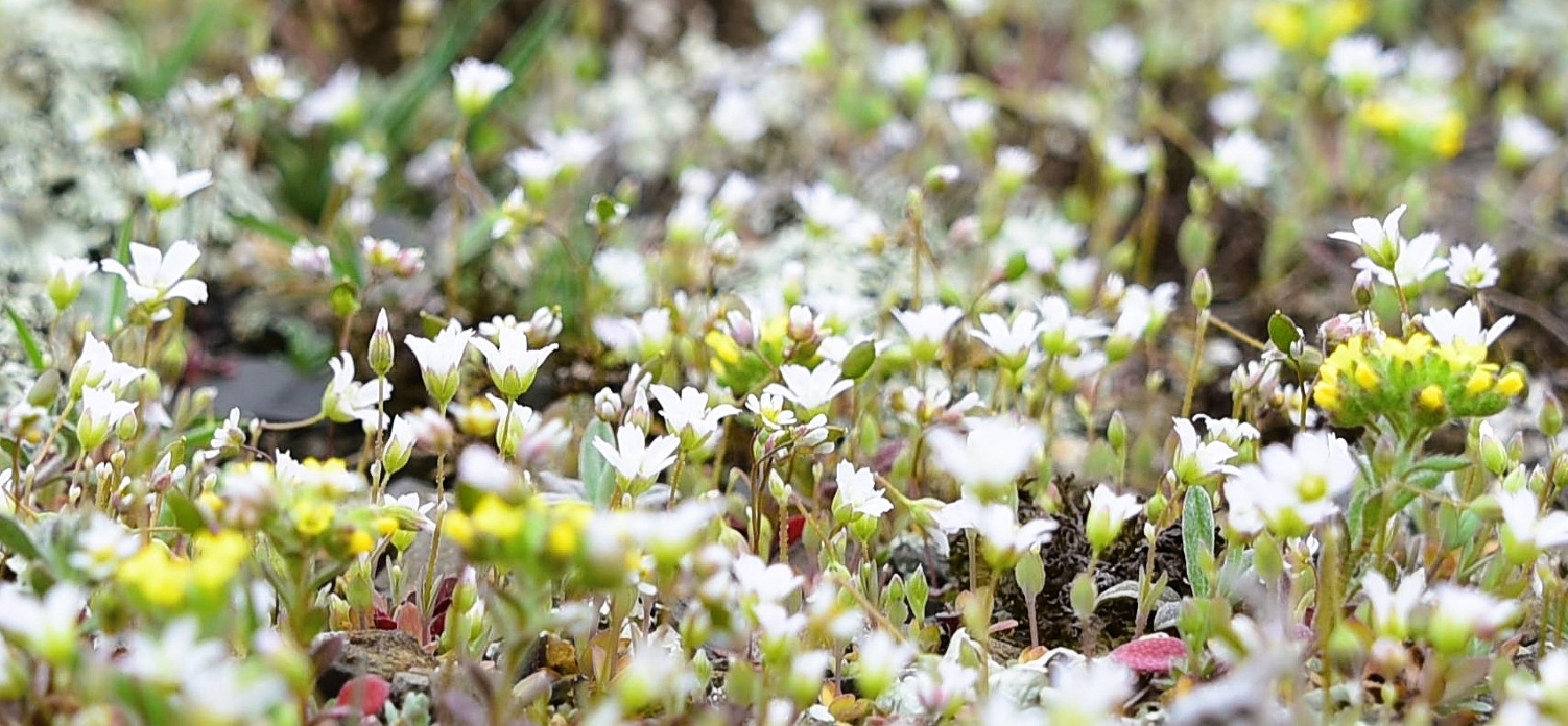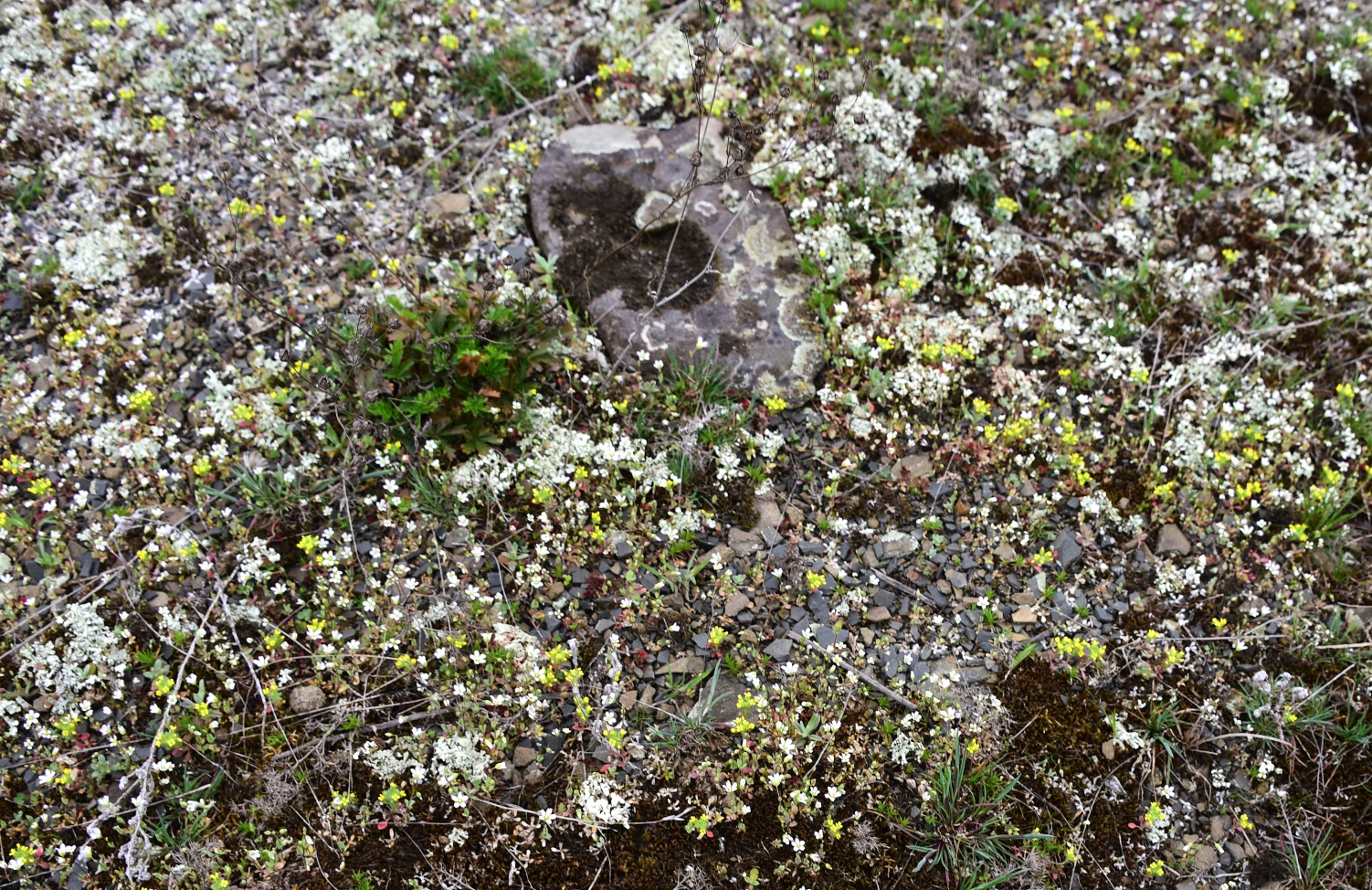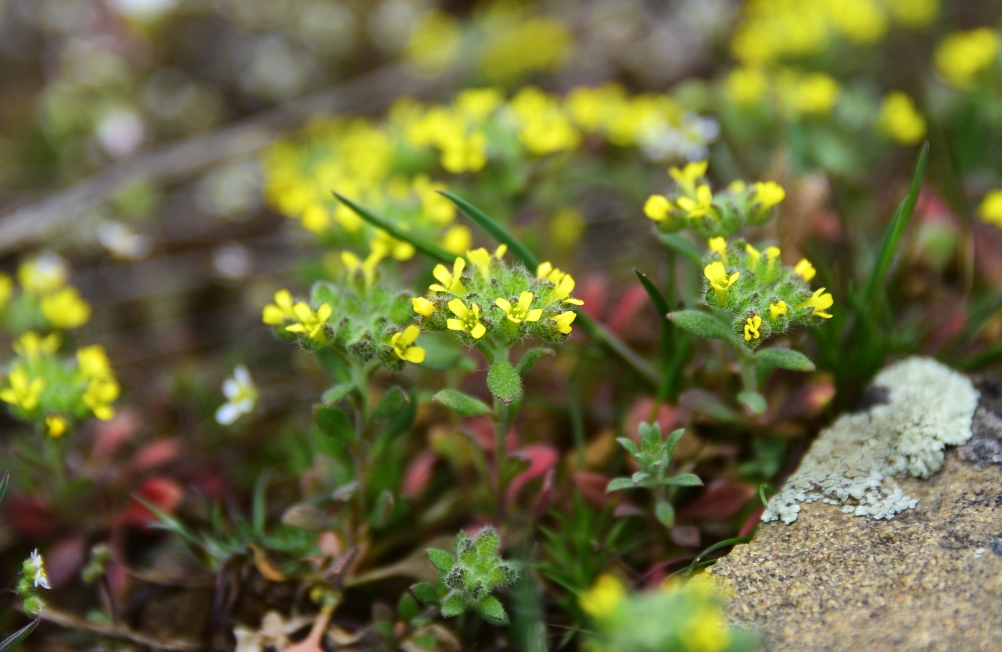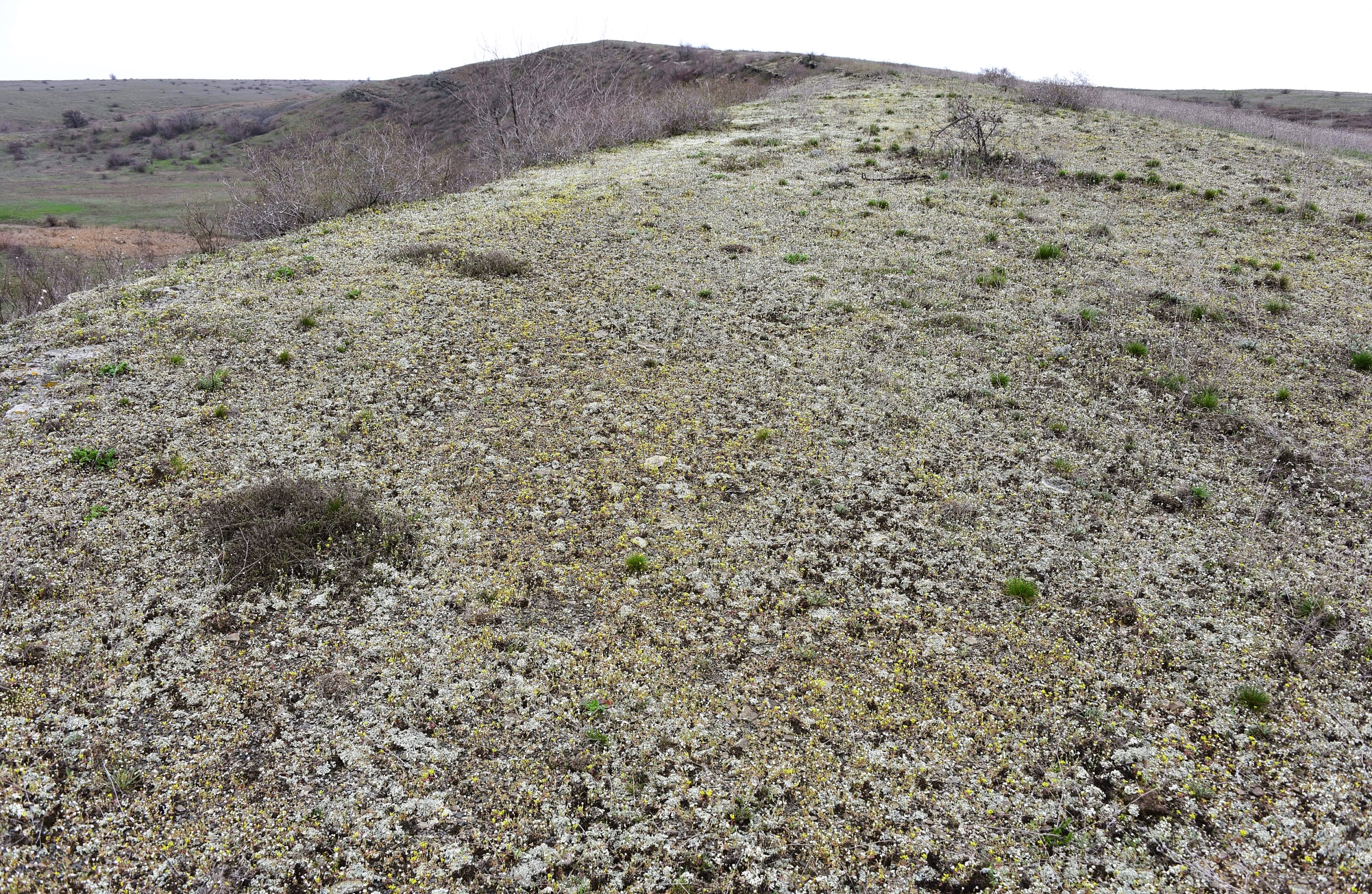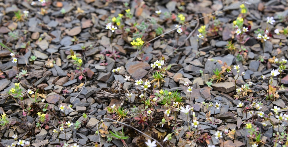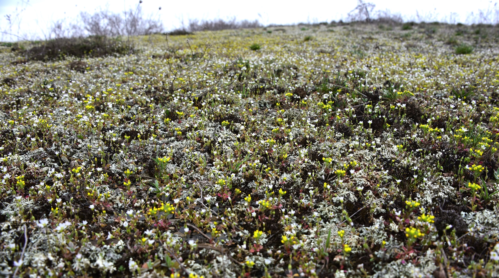 И среди цветных камней и прошлогоднего сора вы увидите цветущую степь. Белые шары кладонии листовой, желтые цветы бурачка простого, крестики веснянки весенней, и колпачки костенца зонтичного.