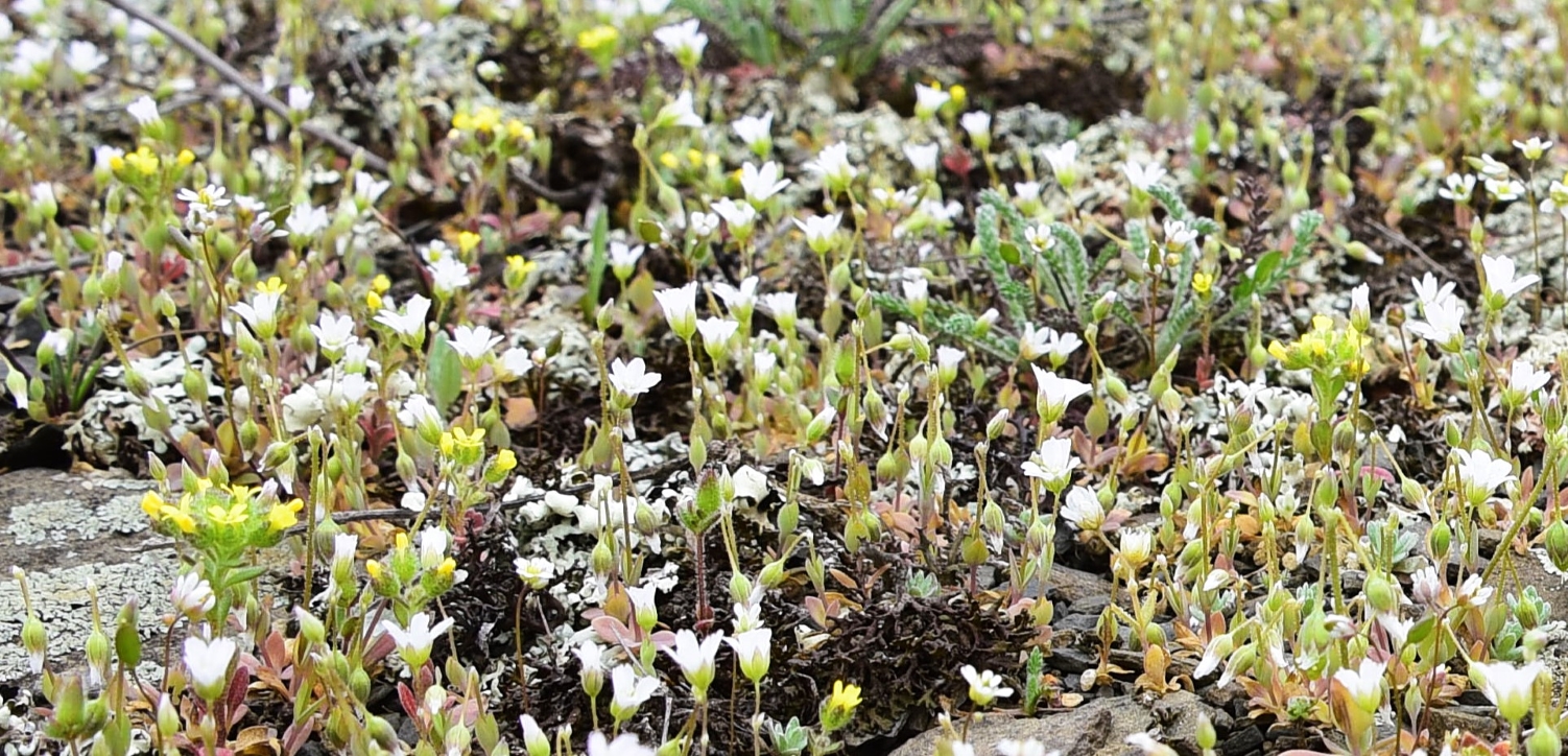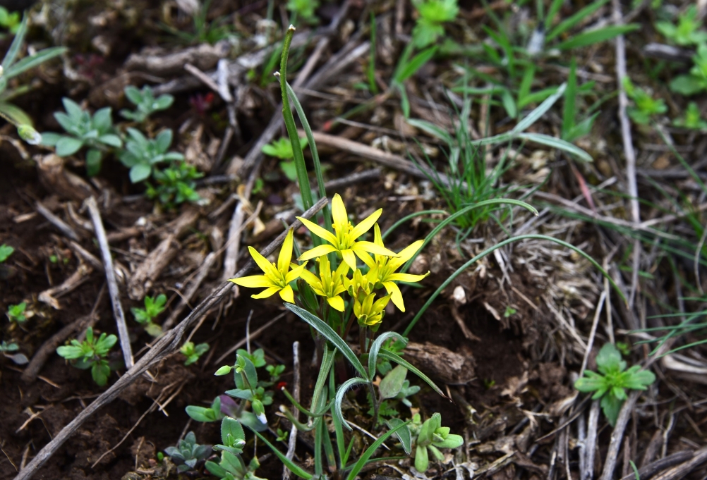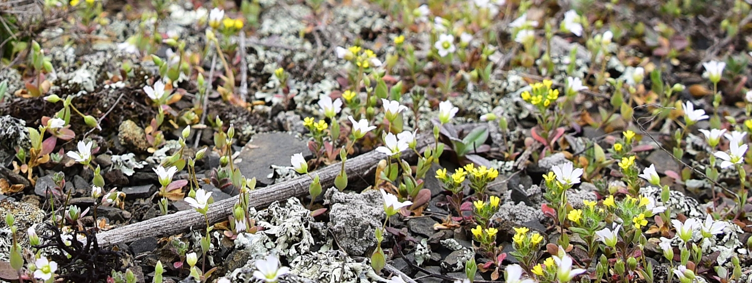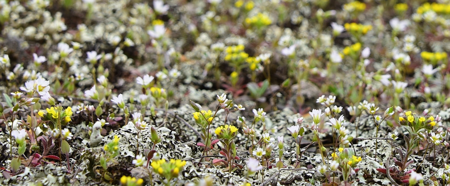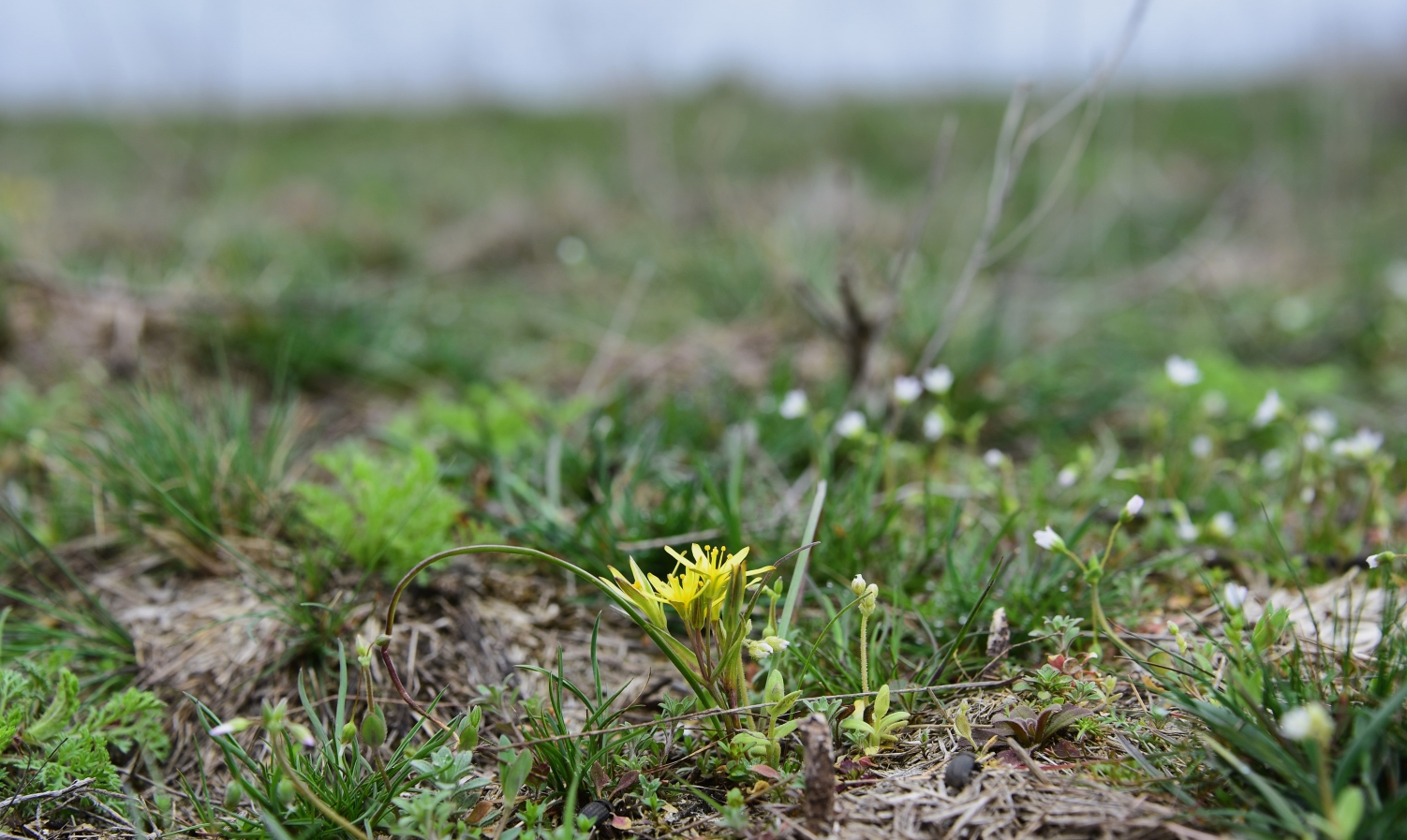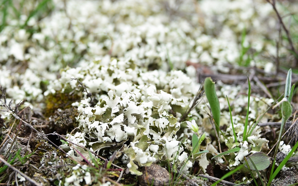 И среди цветных камней и прошлогоднего сора вы увидите цветущую степь. Белые шары кладонии листовой, желтые цветы бурачка простого, крестики веснянки весенней, и колпачки костенца зонтичного.