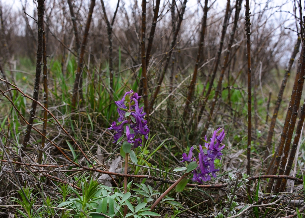 Сиреневая метёлка хохлатки – нежная редкость для открытой степи. Здесь она прикрылась плотными зарослями сибирька.