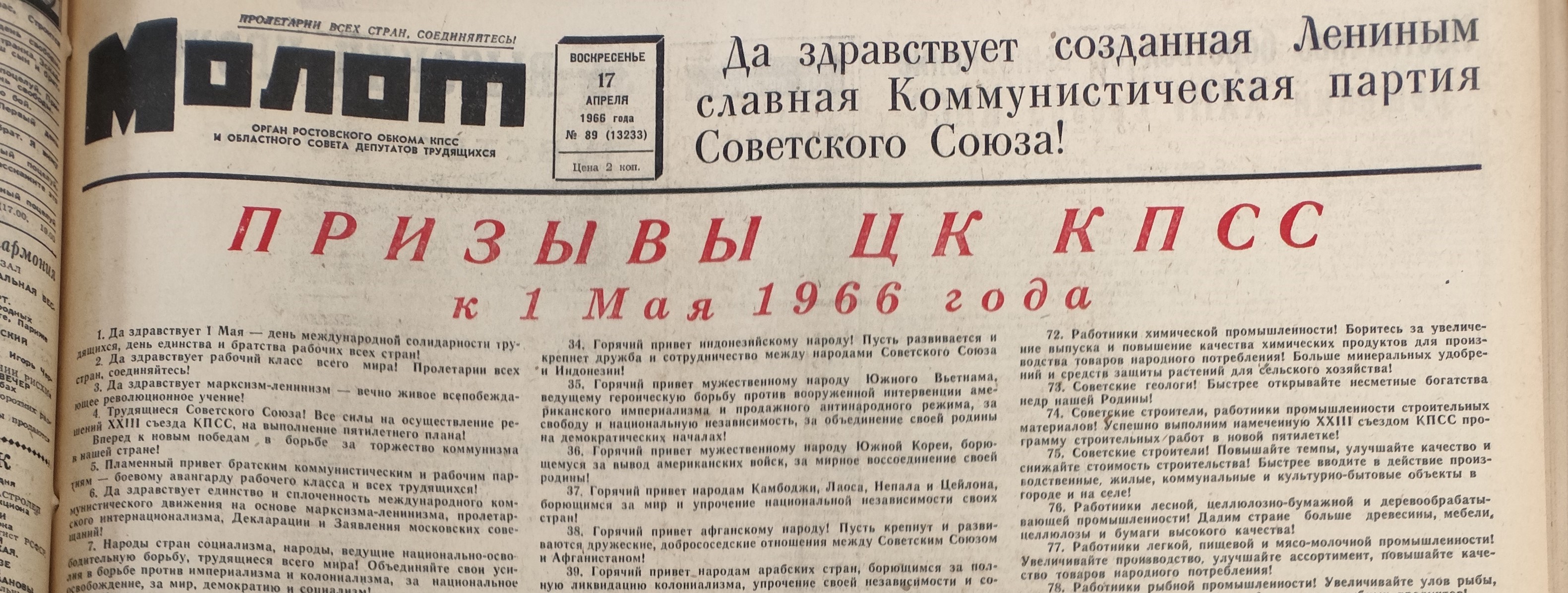 Ровно 60 лет назад, 17 апреля 1966 г., ЦК КПСС обнародовал «призывы» к 1 мая.