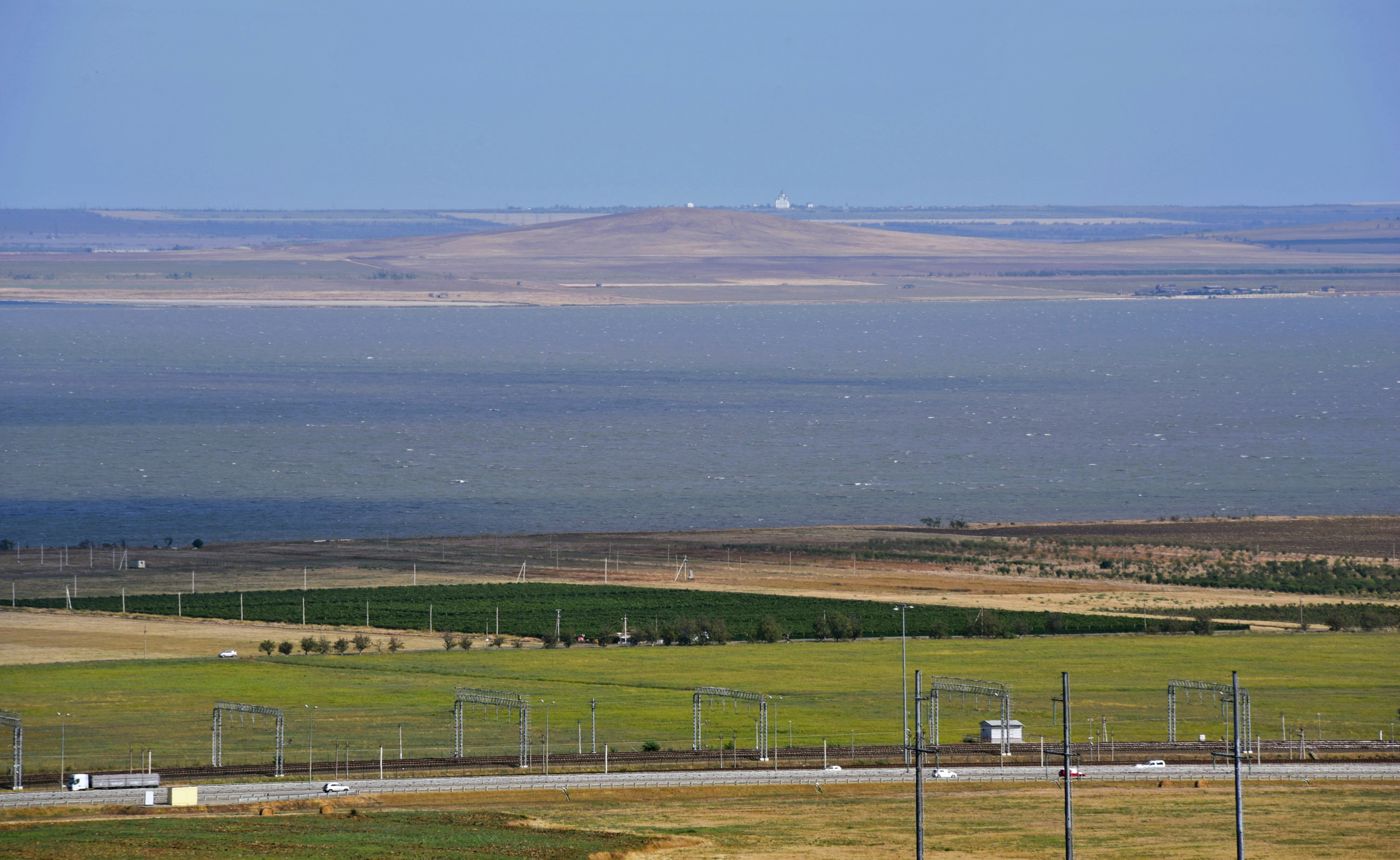 Под нами автомобильная и железная дорога к Крымскому мосту. Таманский залив, в котором смешивается зелёная вода Азовского и синяя вода Чёрного морей. За заливом потухший грязевой вулкан – гора Горелая. Виден храм Святой Живовоначальной Троицы в посёлке Приазовский на берегу Азовского моря.