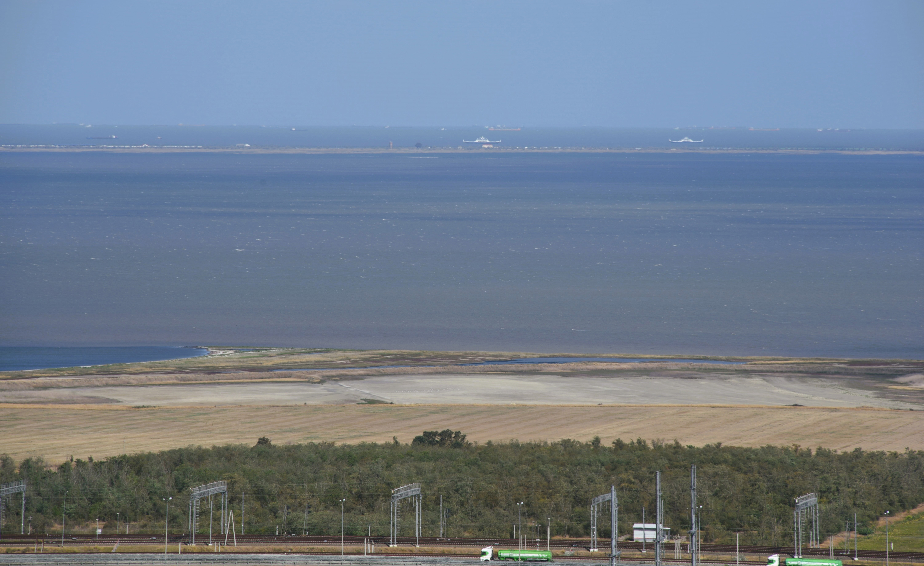 Таже атомобильная и железная дорога к Крымскому мосту. Сине-зелёный от воды двух морей, Таманский залив. Тонкая полоска земли – коса Чушка. А за неё паромы и корабли, корабли, корабли. Это ещё Азовское море.