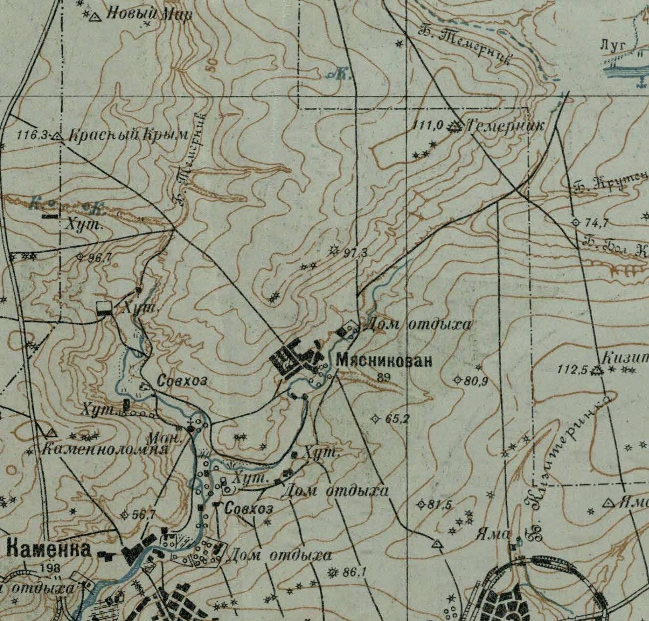 А вот советская карта 1931 года. Здесь непонятки - обе речки называются Балка Темерник. Их истоки не выражены, видимо, заросли или пересохли. А что за объект - треугольная с зубцами хрень, с отметкой 111,0 и названием "Темерник". Конечно, завтра посмотрю оригинал - там были условные обозначения...