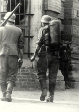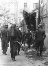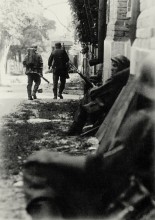 В сети мне попались фотографии, сделанные немцами предположительно во время второго штурма Ростова 24-25 июля 1942 года. Немецкие солдаты при помощи огнемёта выжигают помещения, в которых могли оставаться красноармейцы.