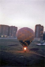 90-е. Всяк выживает, как может. Кто приспосабливается, кто бизнес свой строит. Некие люди устроили для желающих катание на воздушном шаре на бульваре Комарова между проспектом Космонавтов и водоемом. Сейчас на этом месте парк. А в то время был пустырь, исчерченный тропинками во всех направлениях. Единственным строением на всей этой территории был строительный вагончик и несколько сараев Казанской церкви. Они видны на снимке.