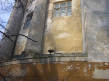 Проходя мимо школы, вот уже не меньше десятка лет вижу у подножия колоннады этот стульчик. Возможно, его выбросили из окна кабинета пения, и он аккуратненько так угодил на участок карниза прямо между колоннами, причём встал правильно на ножки и с тех пор не завалился. Достать со второго этажа его легко можно с помощью лестницы, но почему-то никто этого так и не сделал. И вот стоит этот стульчик на краю стены и вроде как никому не мешает. Уже сгнила и отвалилась спинка, потемнело и разбухло от влаги сиденье, а он стоит. И ветра ему нипочём, и снега ему нипочём.