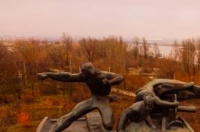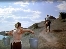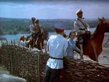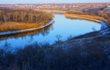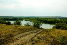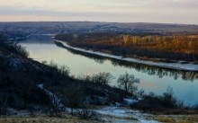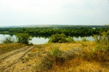 Северский Донец. Хутор Диченский и лесное урочище Хоботок на противоположном пологом берегу. Здесь режиссер Сергей Герасимов снимал свой «Тихий Дон», вышедший в 1958г. Крутые склоны в правом верхнем углу кадра – главное место действа. Там, на высоком берегу, режиссер поместил хутор Татарский.
