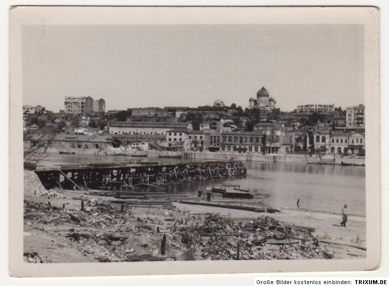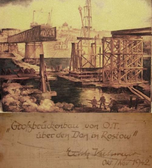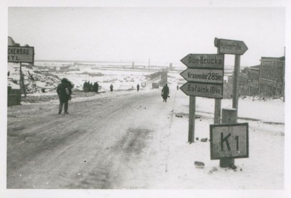 "От здания театра мы прошли на окраину города к Дону. Там увидели разрушенную пристань. Мост через реку тоже разрушен. Немцы построили понтонный мост для тяжелой техники. Рядом с ним они строят еще один мост, имени маршала Антонеску, на дубовых сваях."
