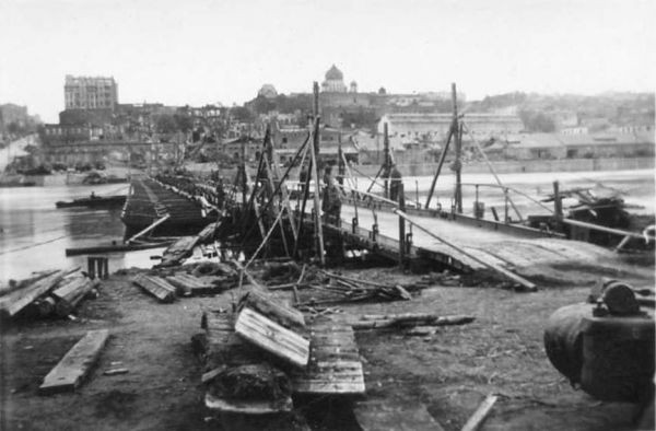 Хотя надо признать, что немцы очень быстро построили не один а целых два моста – понтонный и высоководный. На следующем фото хорошо виден уже готовый понтонный мост (на 70 метров выше по течению от Буденовского) и начало строительства высоководного моста в створе Буденновского.