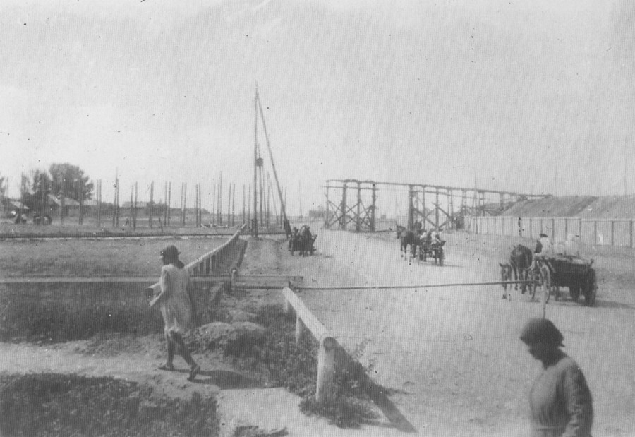 По поводу того, что железная дорого скорее проходит перед домами, соглашусь.Красный овал - скорее всего коновязь. На строительстве было задействовано большое количество гужевого транспорта. Действительно, строительство такого пешеходного перехода вызывает недоумение. Но эстакадой для подачи энергоносителей, это сооруженеие тоже вряд ли было.