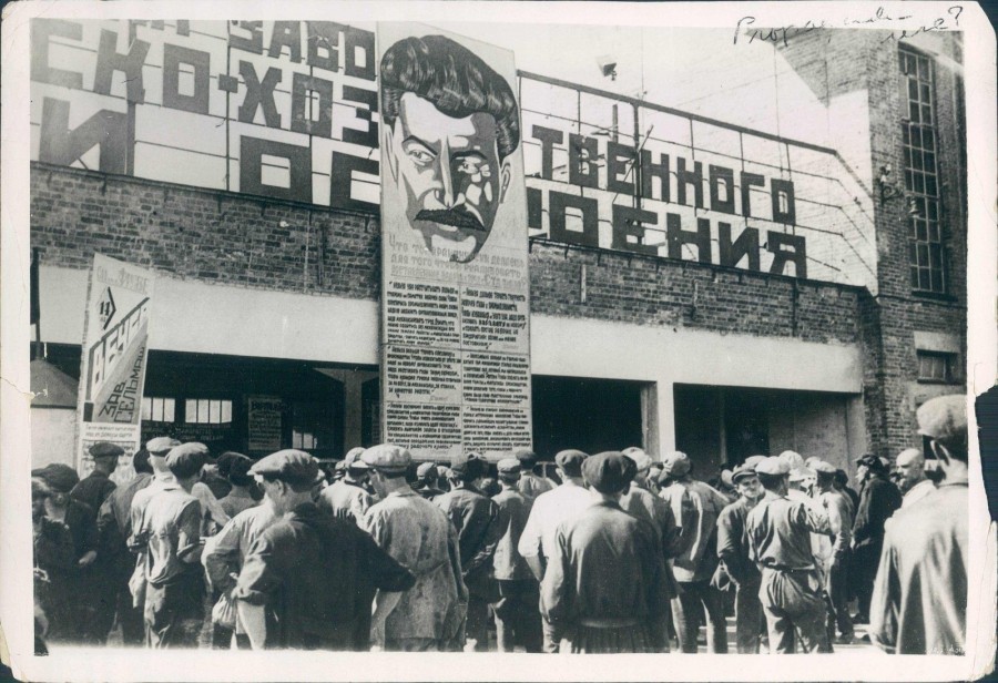 Это редкое довоенное фото. И Сталин такой молодой смотрит на отвалившуюся букву «Н» в слове Машиностроения.