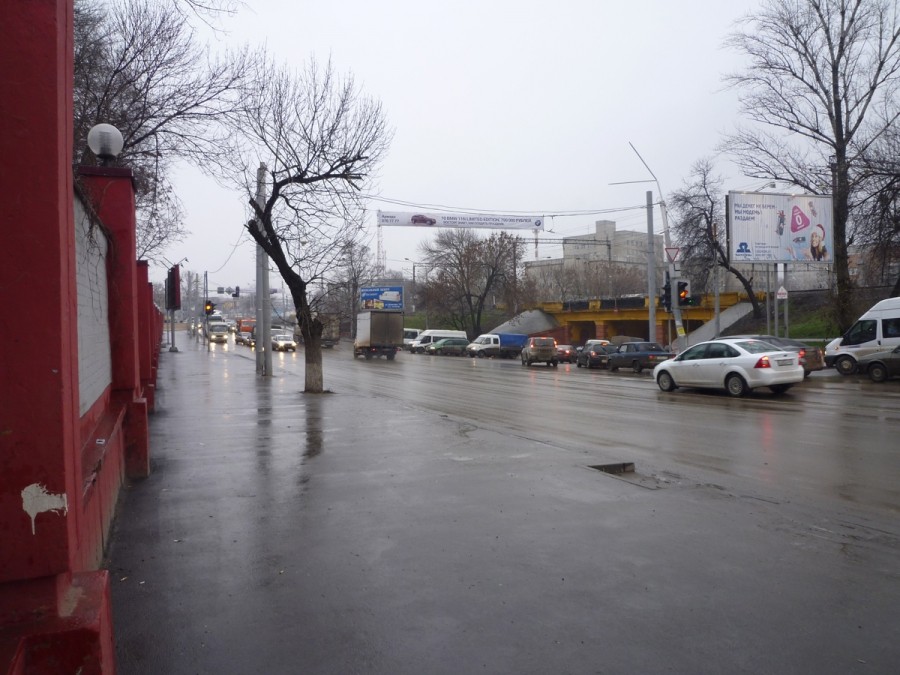 Как-то так. В правой части видны легковые автомобиле стоящие на "горе" за забором. Перед нами Менжинского. В левой части - железная дорога.Менжинского была значительно уже. И дисторсия объективов очень разная.