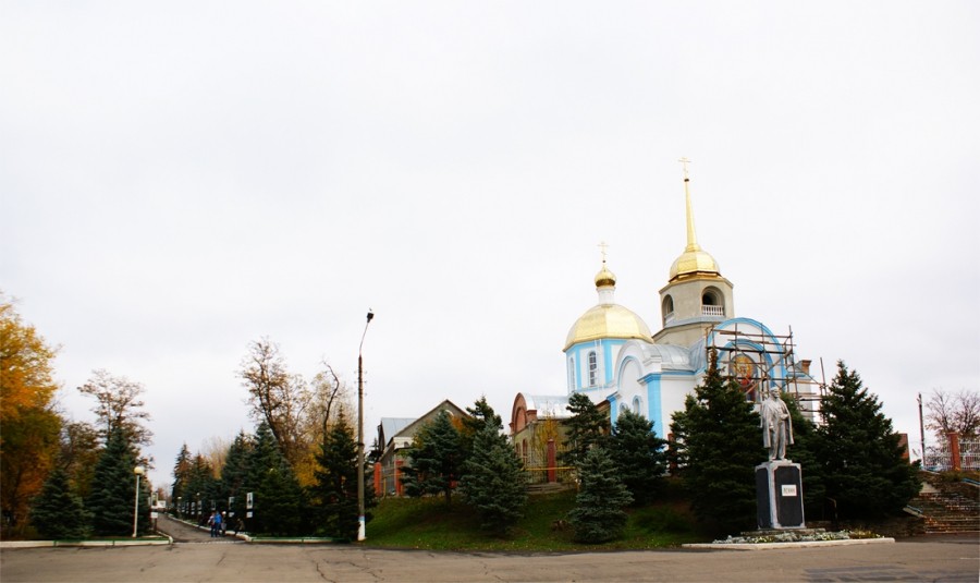А потом, побродив вокруг церкви Рождества Пресвятой Богородицы (построена в 1913) и успокоившись, начал понимать, что квадратный барабан со скошенными углами и тройными разновысокими окнами, вещь с большой претензией. И простым куполом его не увенчаешь. Наверное такой и нужен. И двухъярусная звонница в тон барабану. Вся остальная церковь с аспидой как бы спряталась под ними. Кирпичный стиль расцвета России начала 20-го века.