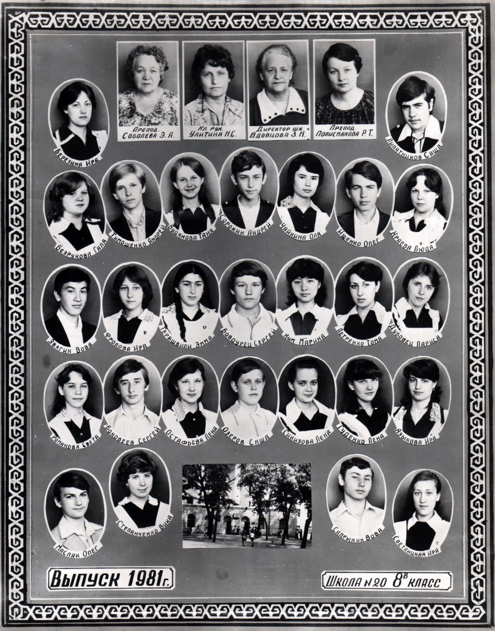 А эта фотография была в числе вынесенных из школы в последние дни. Один из восьмых классов с классным руководителем Ростовцевой Тамарой Степановной.