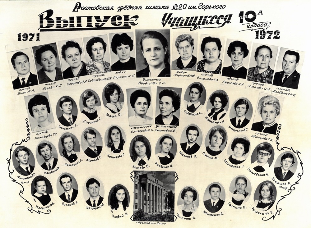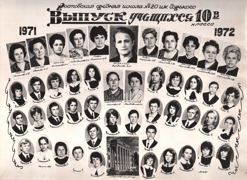 Выпуск 1972 года. Обсуждая школьные выпускные фотографии, мы отмечали, что на них не всегда была сама школа. Казалось бы, вставить на память фото здания школы в альбом должно быть моментом обязательным, но фотографы, собиравшие из наших физиономий эти альбомы, почему-то думали не так. На этот раз фотоизображение заводоуправления Ростсельмаша является единственной дополнительной фотографией в представленном вашему вниманию альбоме. Возможно, так подчёркивалась роль завода в жизни школы. Теперь же, благодаря этим снимкам, мы делаем маленькие открытия из истории нашего района и города.