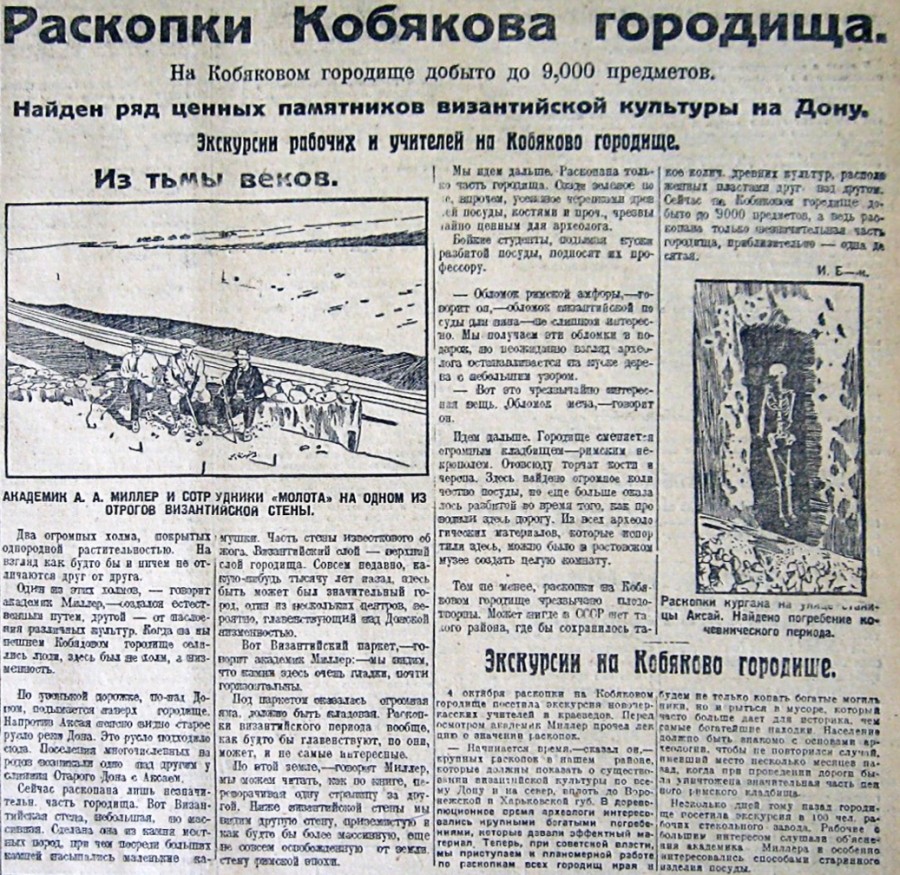 И еще горькая ремарка. Слова А.А. Миллера из того же Молота. «В дореволюционное время археологи интересовались крупными богатыми погребениями, которые давали эффектный материал. Теперь, при советской власти, мы приступаем к планомерной работе по раскопке всех городищ края и будем не только копать богатые могильники, но и рыться в мусоре, который часто больше дает для историка, чем самые богатейшие находки» Неуклюжий комплимент Советской власти не помог академику. Она его уничтожила.