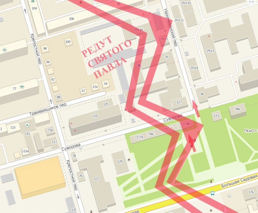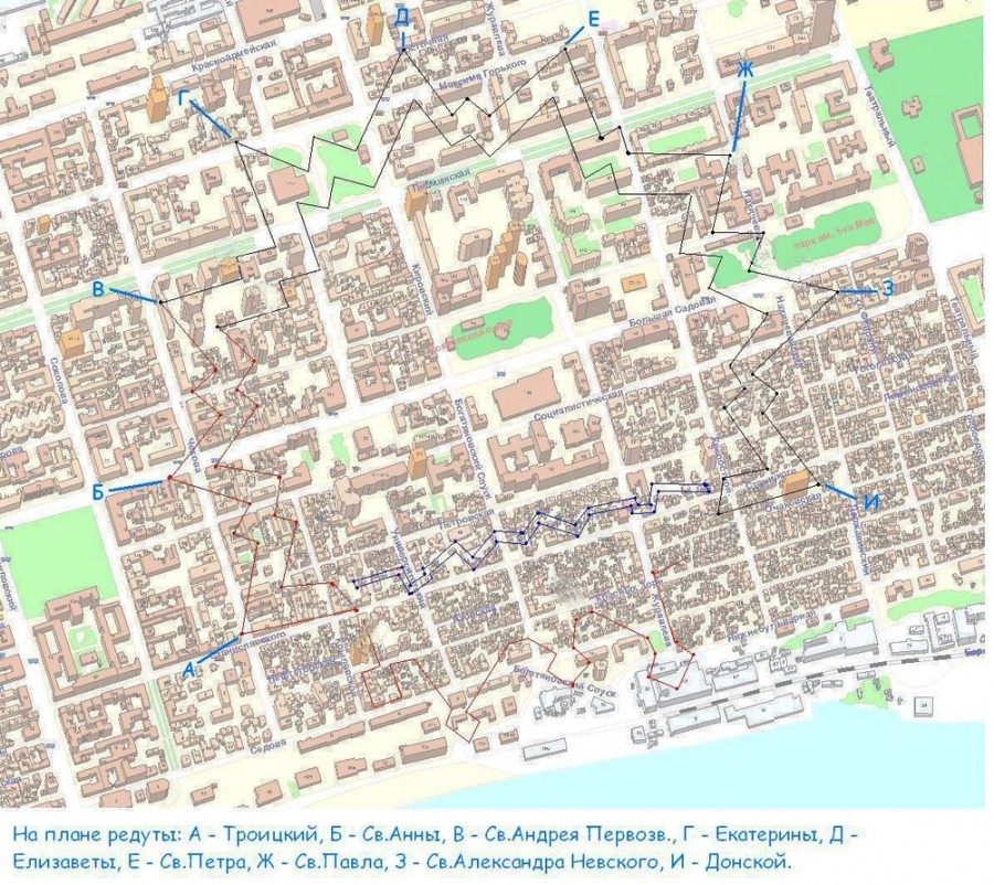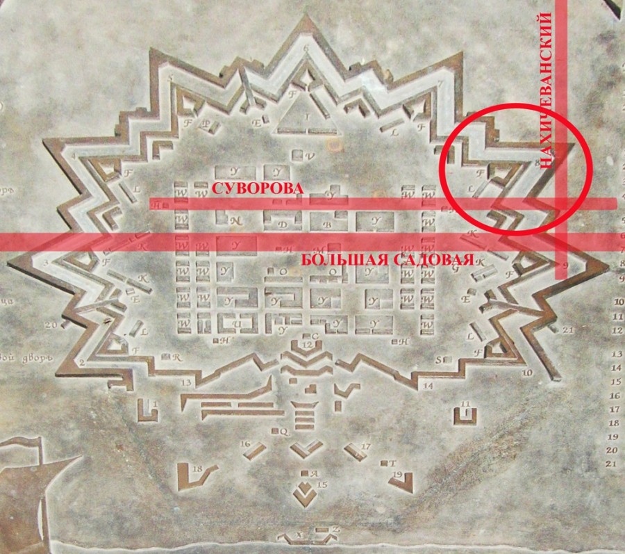 Вершина редута режет переулок Нахичеванский между Пушкинской и Суворова.