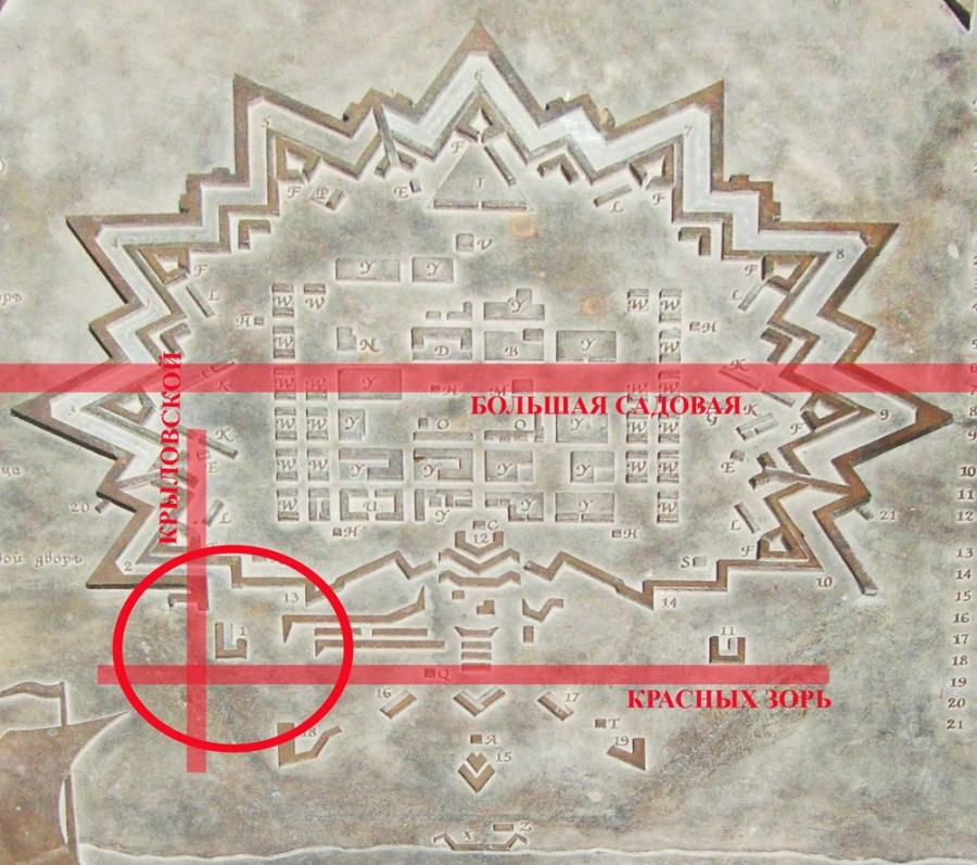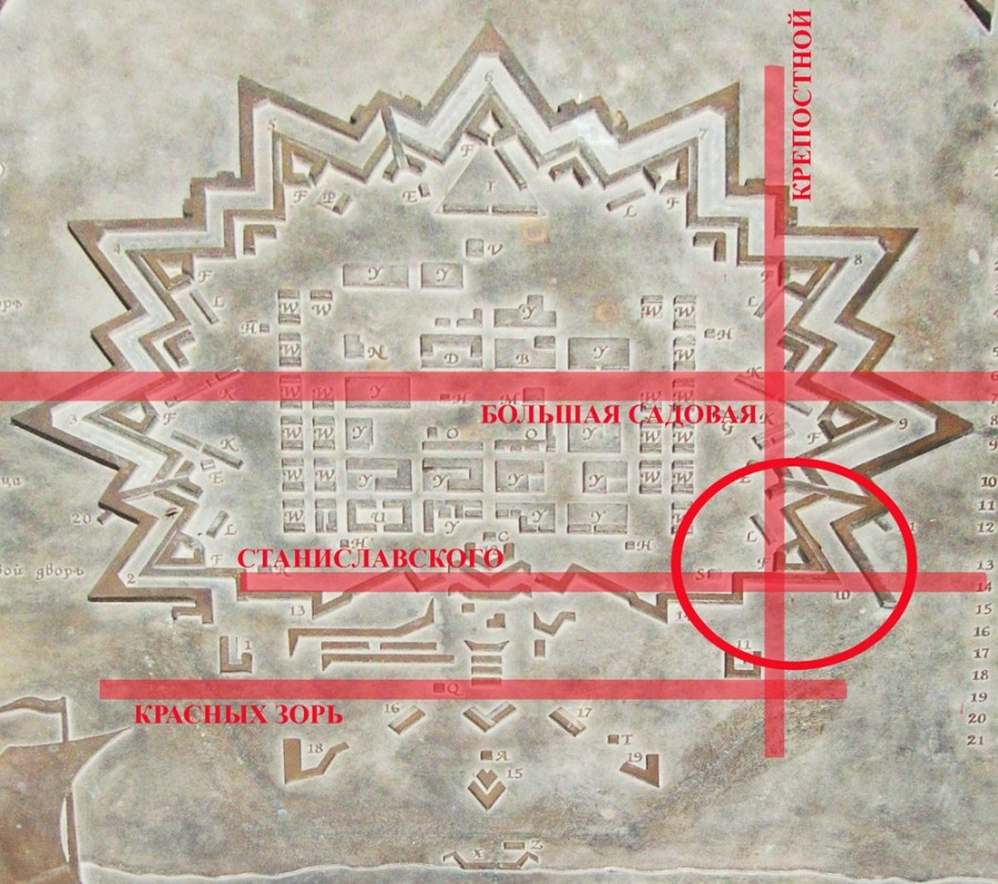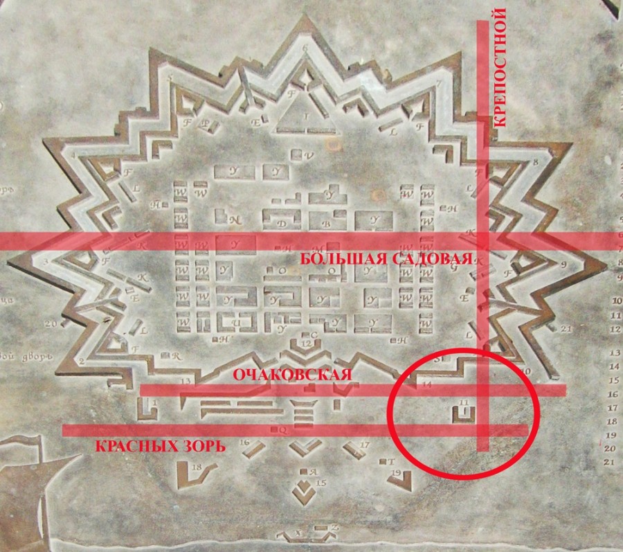 Начнем путешествие с Темерницкого редута. Он располагался в юго-западной части укреплений и не был связан с девятиконечной звездой основных валов крепости. Перевернутую букву «Г» редута, я поместил в центр красного круга.