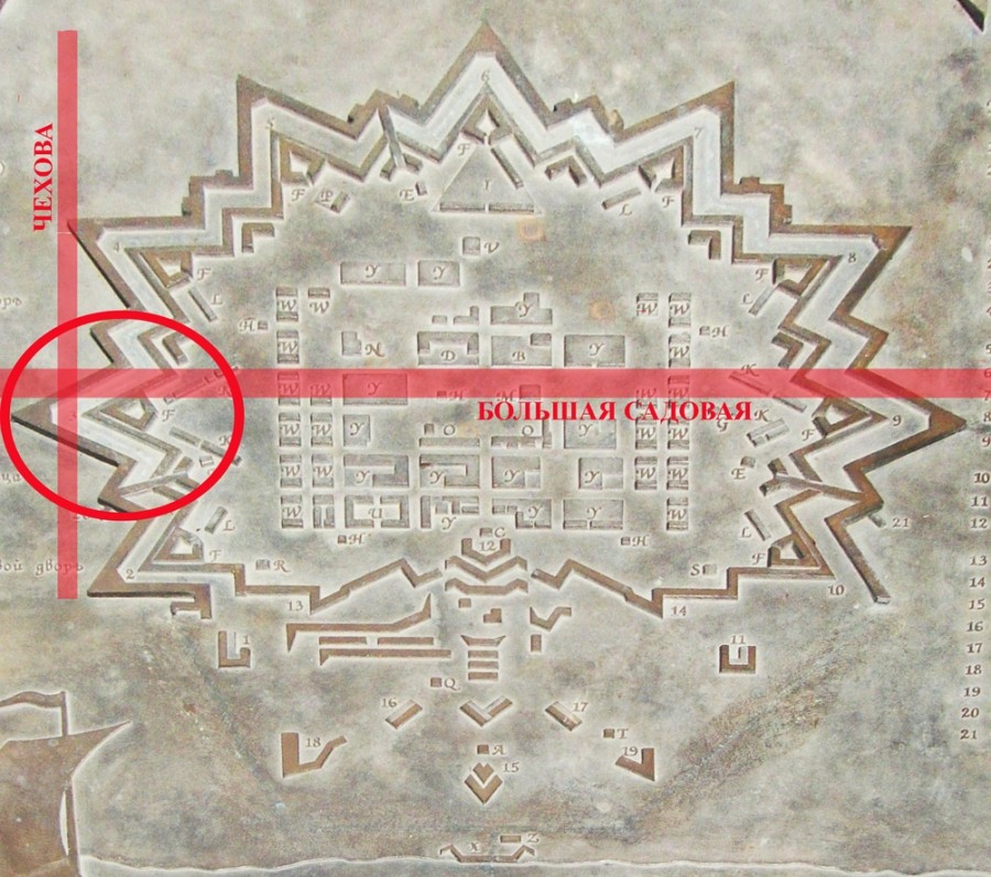 Следующий объект – Редут Святой Анны. Вершина этого редута режет нынешний проспект Чехова чуть ниже Б.Садовой.