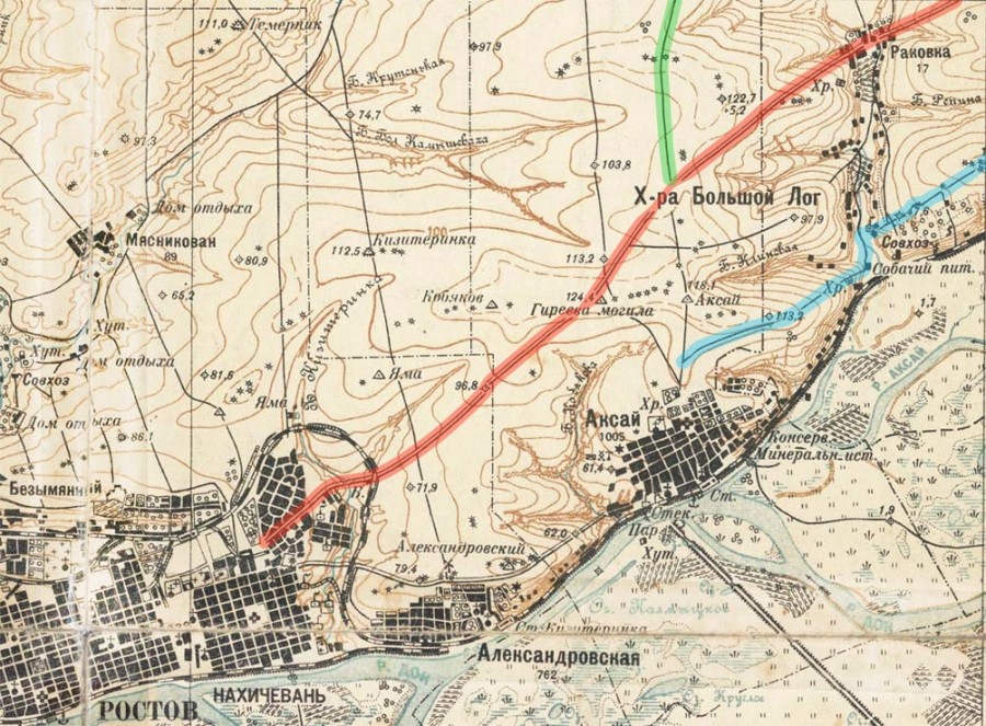 А синим начертил дорогу, которую сейчас принято называть «Старой Ростовской». Она начинается в центре Аксая и, проходя через Александровку и Мишкино, заканчивается в Новочеркасске.