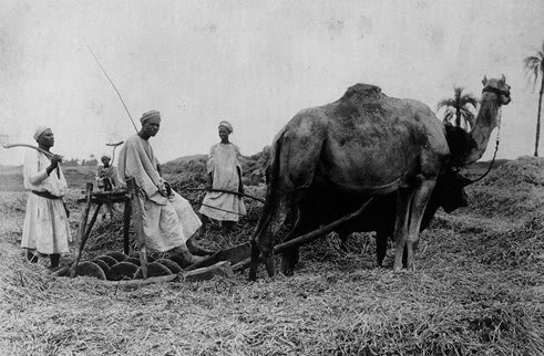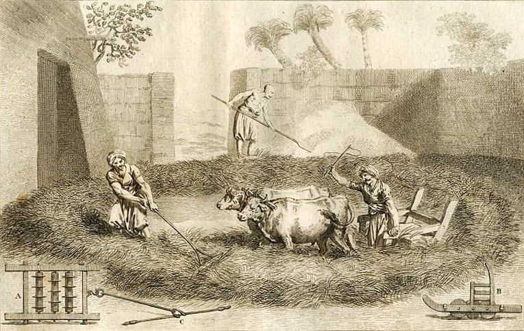 На этой картинке реконструкция молотьбы в древнем Египте. Пара быков таскает по кругу волокушу, под которую из центра круга постоянно подбрасывают пшеничные стебли. Перемолотая масса скапливается на внешнем кольце, откуда ее берут лопатами и провеивают на искусственно создаваемом ветру. Собирая в бурт чистые зерна.