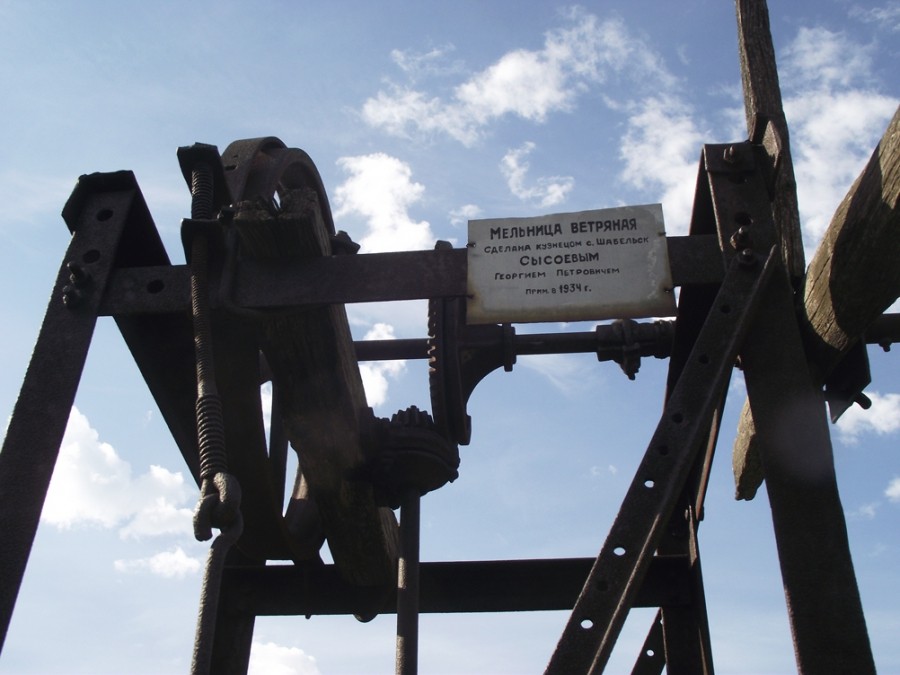 Построена эта мельница сравнительно недавно, в 1934 г.. Табличка сообщает, что ее автор, кузнец соседнего села Шабельское, Георгий Петрович Сысоев.