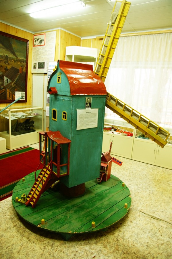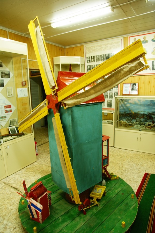 Еще одна замечательная находка встретила меня в музее станицы Егорлыкской. В начале статьи уже упоминалось о сгоревшей мельнице в хуторе Ильинка. У меня была слабая надежда найти в Егорлыкском музее какие-то ее следы. Но когда в одном из залов музея я увидел двухметровую действующую модель Ильинской мельницы, которая может не просто демонстрировать движение механизмов, но и молоть зерно, а построена эта модель настоящим мельником, который участвовал в реставрации большой мельницы в Ильинке, можете представить мой восторг.
