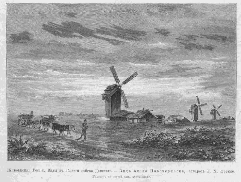 Началось с акварели, которую Алекс выставил когда-то на «Береге». На ней некий Л.Х. Фрикке изобразил окрестности Новочеркасска конца 19-го века. Больше напоминает Испанию, настроением, а особенно ветряными мельницами.